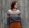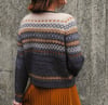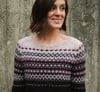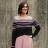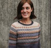 This garment is worked top-down, mostly in the round, with a modified raglan construction. The back of neck and sleeve stitches are cast on first and worked flat whilst beginning the modified raglan shaping and front of neck shaping. Once joined in the round, stranded colourwork is worked whilst the raglan shaping continues. Once yoke depth is reached, the yoke stitches are separated into body and sleeves, each of which are worked in the round, continuing the stranded colourwork pattern. The lower body and sleeves are worked in plain stockinette, although an optional band of colourwork above the waistband is included in the pattern. Above the cuffs, a small amount of stranded colourwork is added to the sleeves. Neckband, waistband and cuffs are worked in half-twisted ribbing.