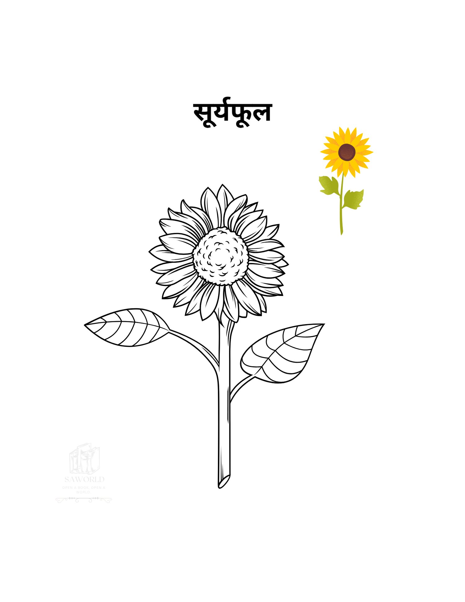 - मराठीत नावे: प्रत्येक फुलाचे मराठी नाव स्पष्टपणे दिले आहे, ज्यामुळे तुम्हाला रंग भरतानाच त्यांची ओळख होईल.