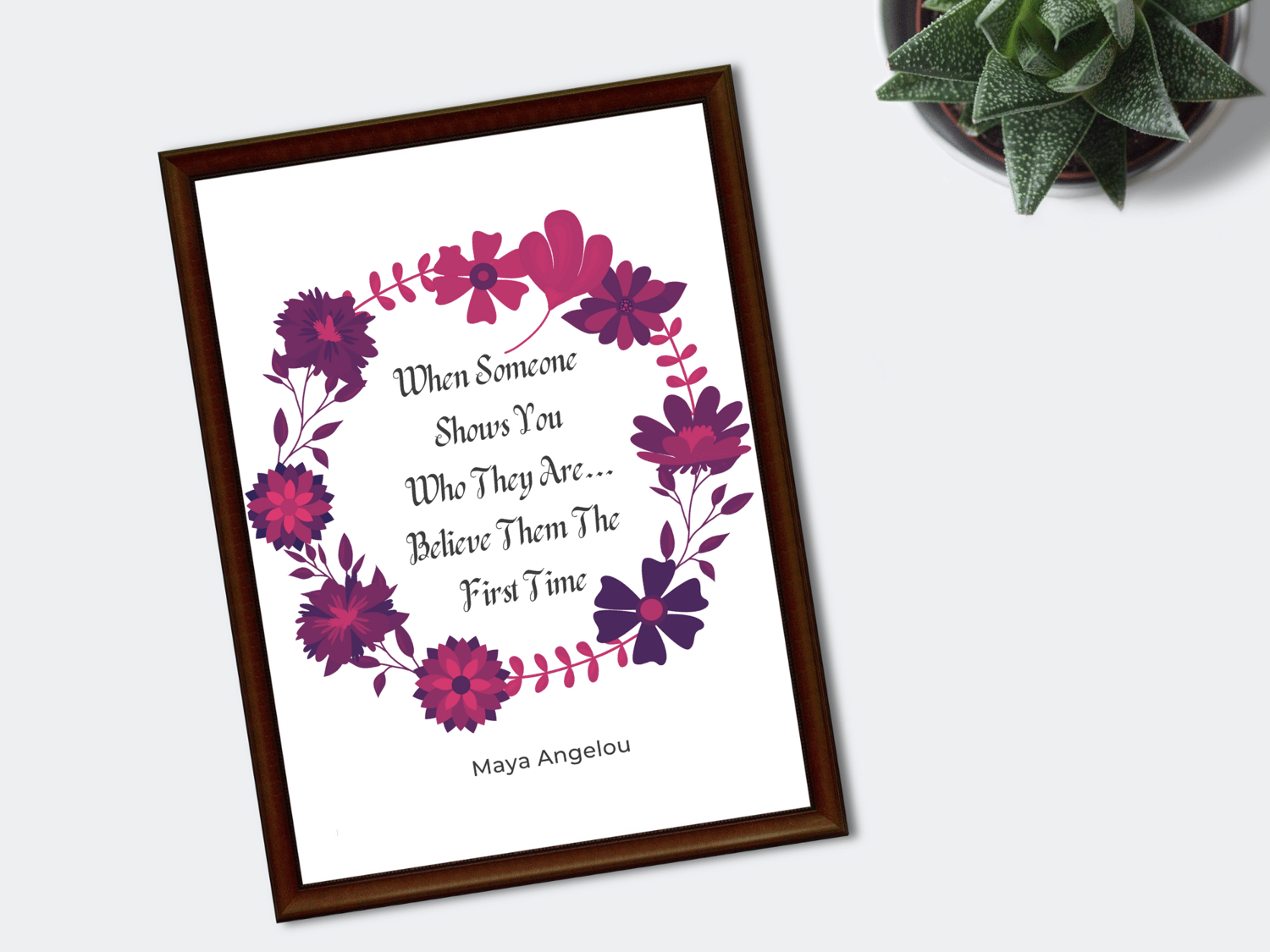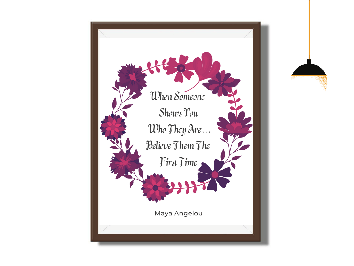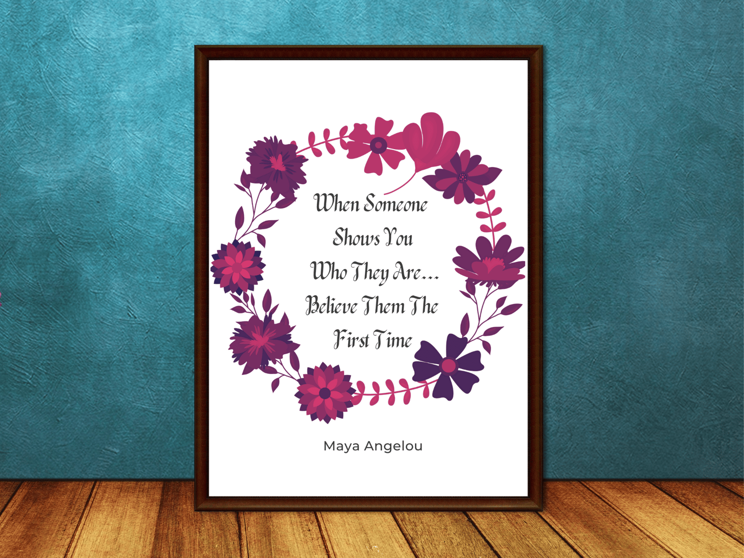 This timeless Maya Angelou inspirational quote is about perception, and how difficult it can be to overcome our preconceived ideas about someone. This quote is about believing what a person demonstrates themselves to be, regardless of who they claim they are or who we want them to be. This offering reminds us to believe what is being demonstrated to us the very first time. Inspiring Digitals are designed to transform, uplift, and inspire. The spoken word is like a wand and when used correctly never ceases to inspire changes from the inside out. It would make a terrific birthday gift for friends and family, or indeed any person who may be venturing into the magical world of transformative quotes and affirmations for the first time. It would also make a great gift for yourself. This digital art print will look great in your Living Room, Office, Bedroom, Kitchen, Bathroom, or wherever you want a reminder of how powerful the spoken word can be. Since it comes in 3 sizes, it's very versatile. And since it's a digital download, it's the most affordable way to decorate!