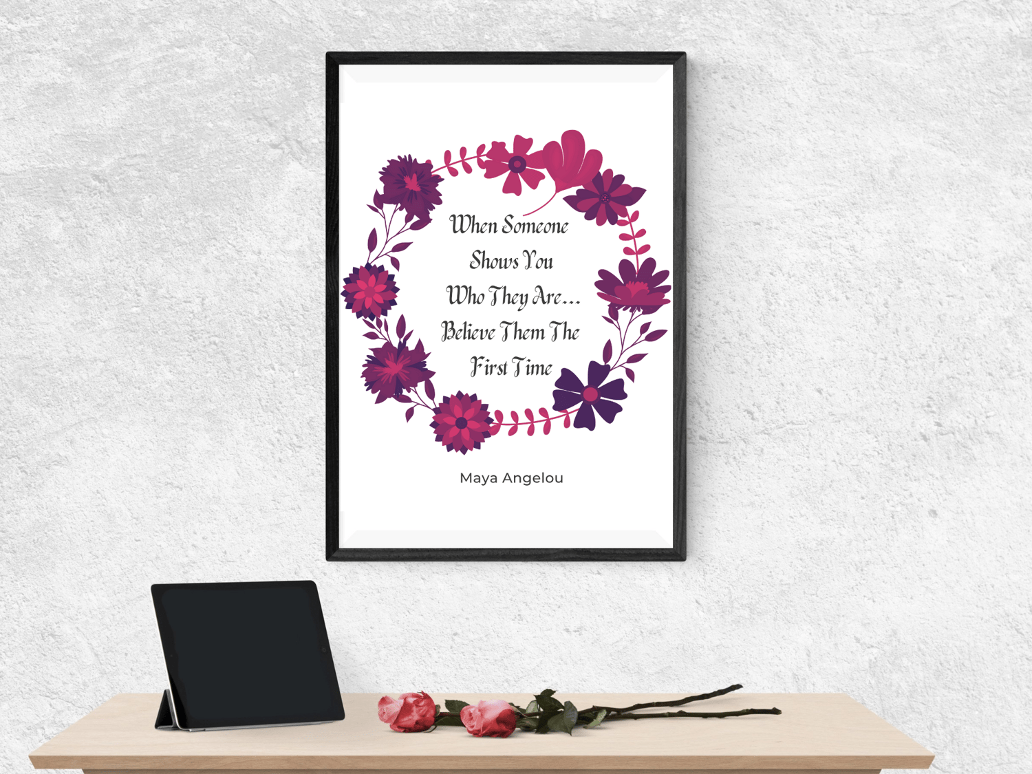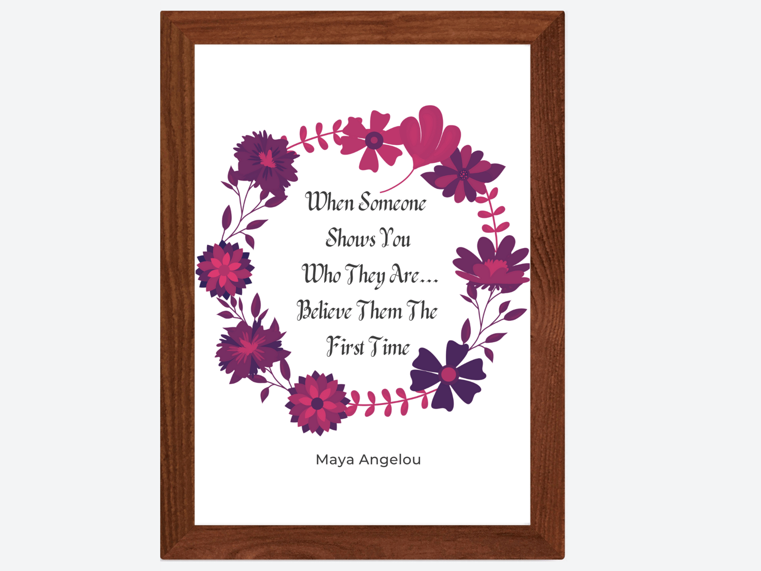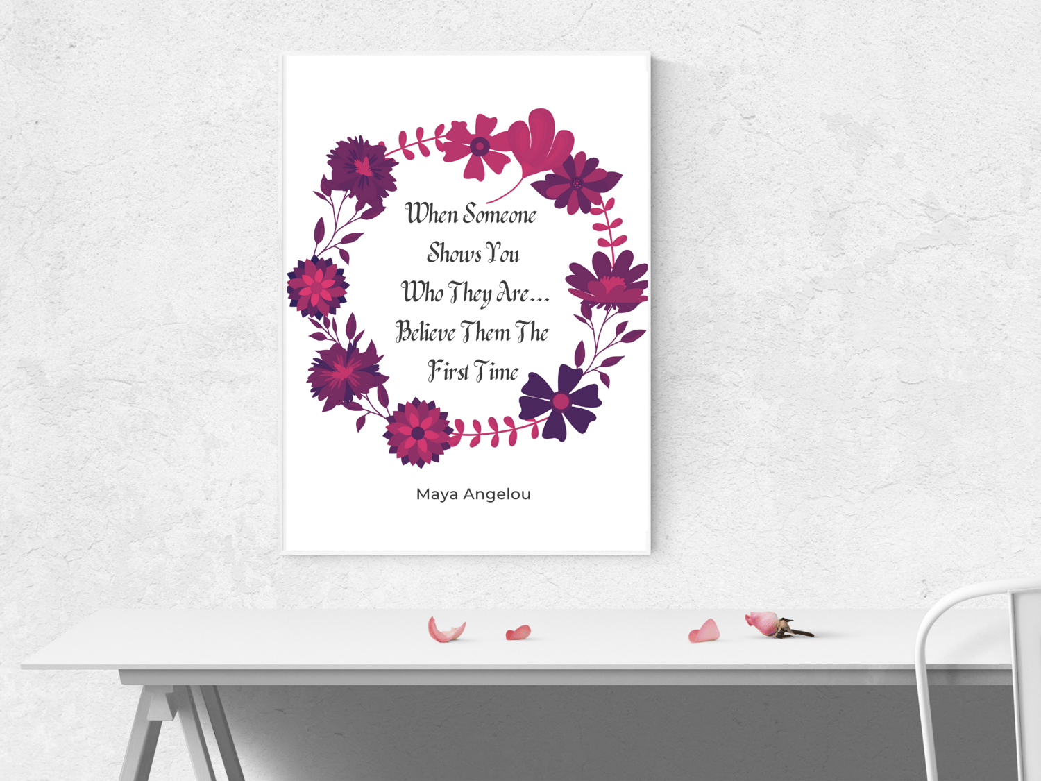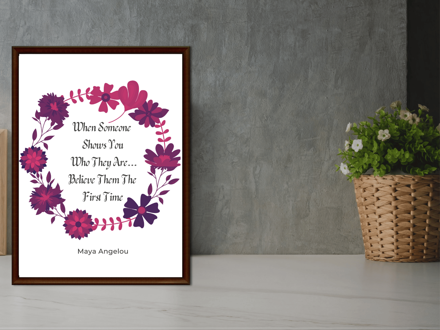 This timeless Maya Angelou inspirational quote is about perception, and how difficult it can be to overcome our preconceived ideas about someone. This quote is about believing what a person demonstrates themselves to be, regardless of who they claim they are or who we want them to be. This offering reminds us to believe what is being demonstrated to us the very first time. Inspiring Digitals are designed to transform, uplift, and inspire. The spoken word is like a wand and when used correctly never ceases to inspire changes from the inside out. It would make a terrific birthday gift for friends and family, or indeed any person who may be venturing into the magical world of transformative quotes and affirmations for the first time. It would also make a great gift for yourself. This digital art print will look great in your Living Room, Office, Bedroom, Kitchen, Bathroom, or wherever you want a reminder of how powerful the spoken word can be. Since it comes in 3 sizes, it's very versatile. And since it's a digital download, it's the most affordable way to decorate!