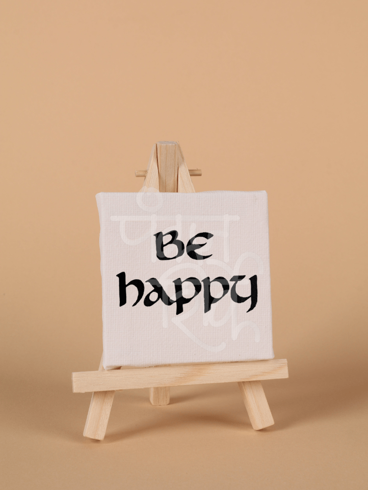 Artwork 'Be Happy' in Handmade Uncial Calligraphy on Canvas Stand