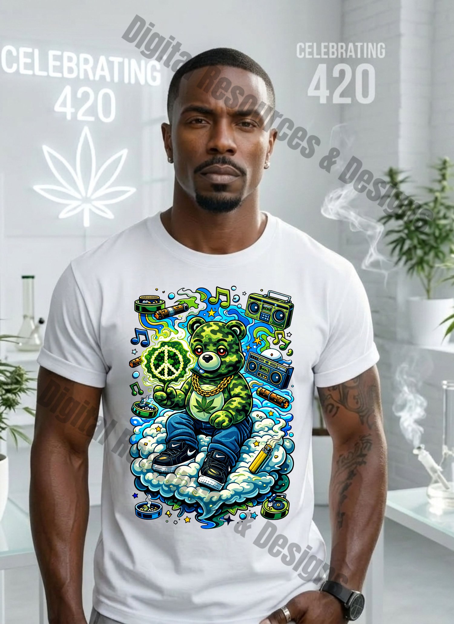 Add a fun, trippy vibe to your next project with this 420 inspired Care Bear–style teddy bear PNG design. This unique illustration features a chill teddy bear character surrounded by smoke clouds, leaf elements, and laid-back vibes—perfect for cannabis-themed apparel and creative projects.