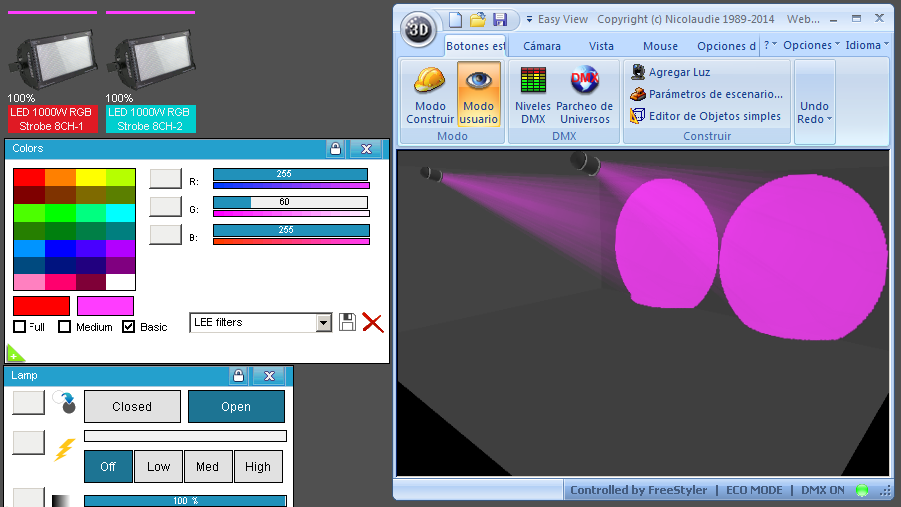 Esta Librería SSL2 está optimizada para trabajar con Magic 3d Easy View. Es decir para ver una representación 3D de las secuencias que estemos realizando con Freestyler, QLC+ o cualquier otro soft que se conecte con Magic 3d.