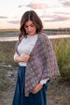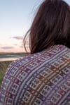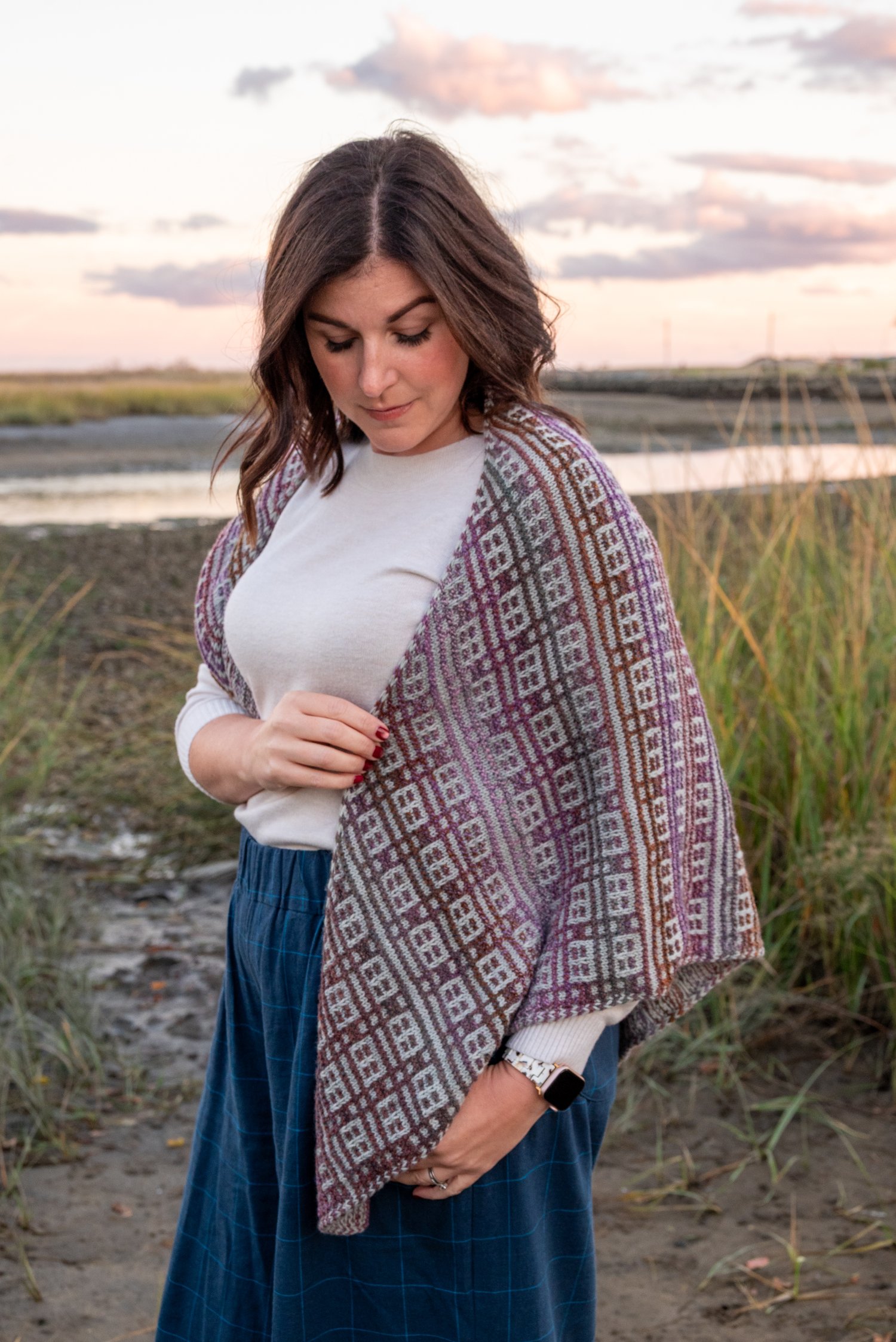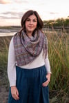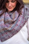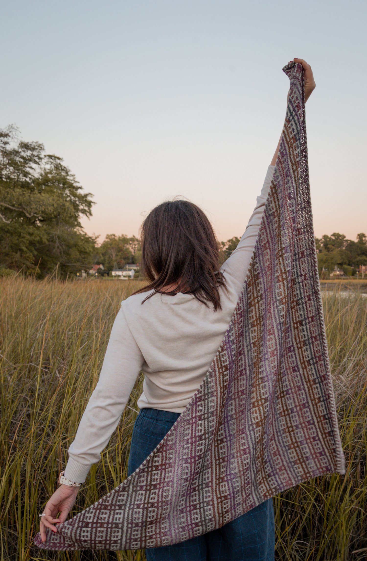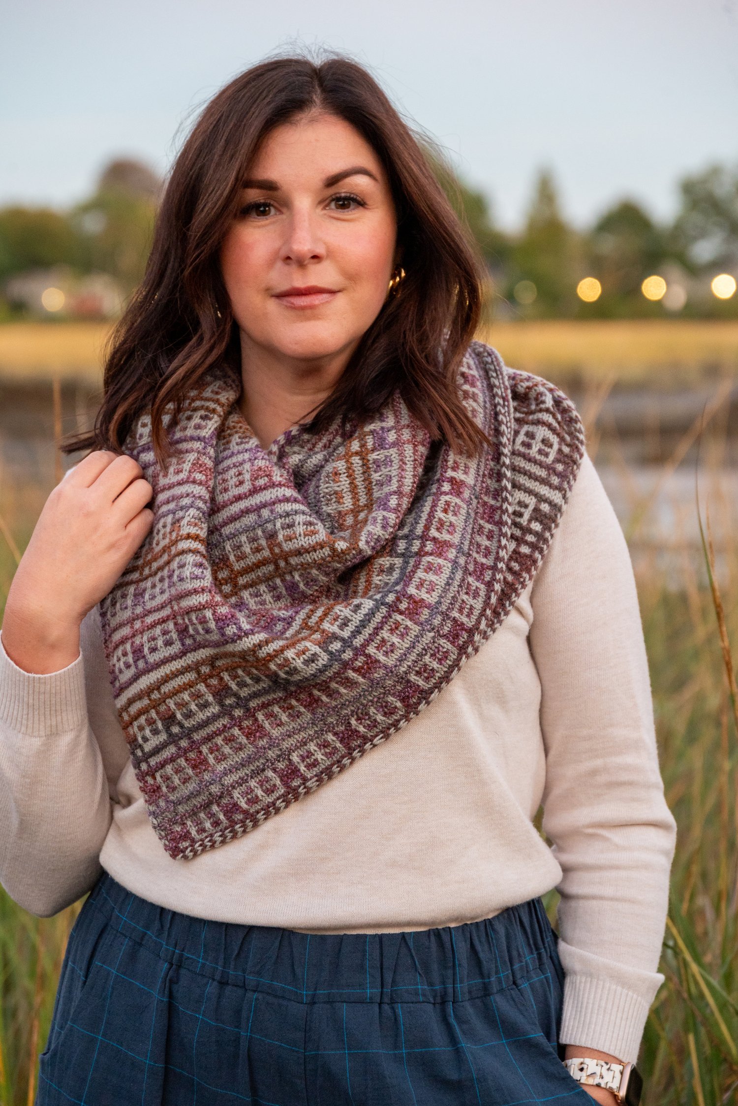 The Flannel Crush Shawl features an allover mosaic colorwork pattern, with only one color used at a time. This triangle shawl is worked flat beginning at one corner and shaped with increases along one edge, resulting in an asymmetrical triangular shape. The shawl has built-in I-Cord edges and an I-Cord bind off.