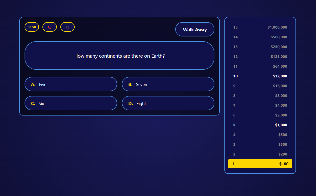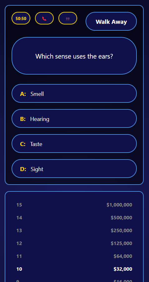 - Dynamic Difficulty Scaling: Just like the show, the game gets progressively harder. Questions are categorized into Easy, Medium, and Hard tiers to keep players challenged.
