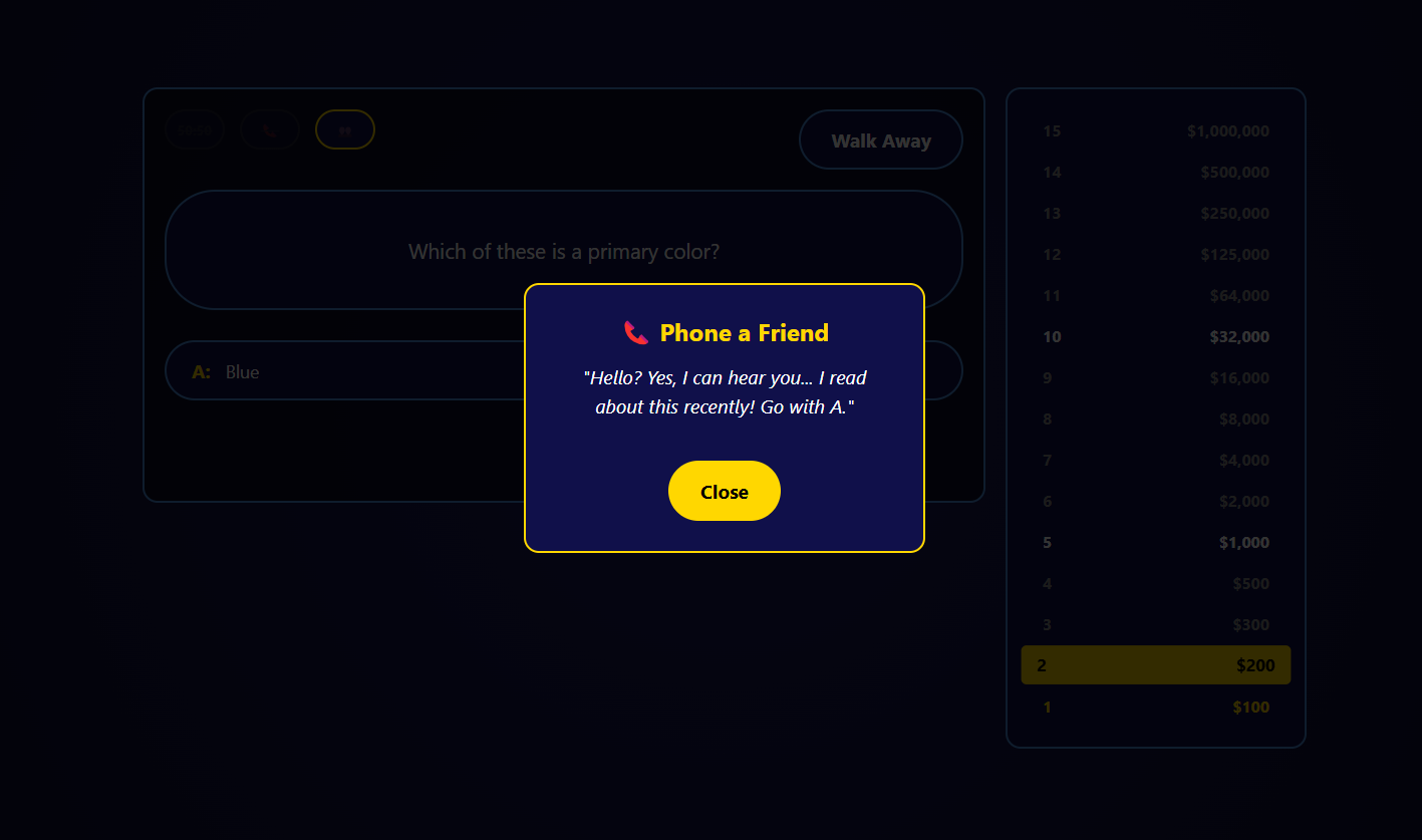 - Authentic Lifelines: Fully functional 50:50, Phone a Friend, and Ask the Audience logic.
