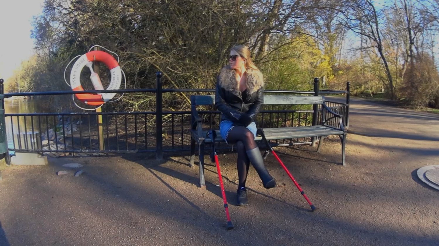 Ice is dressed nicely in a tight skirt and a pair of black pantyhose, looking like a dream in her silky blonde hair. She’s seen sitting on a bench and is right in the middle of a walk with her crutches. Ice is casted in a white SLC on her right leg underneath of those pantyhose. Apparently she fell with her bike and had some very bad luck. After some minutes, Ice got up and took on some stairs just for fun, going up and down to show off what she’s capable of. We see her enjoy the park to the fullest, mostly from a distance and an amazing full body image.