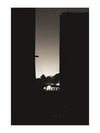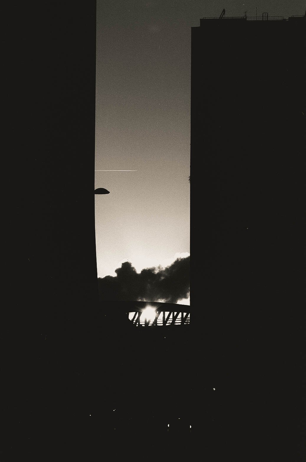 Entre deux grands bâtiments — deux masses sombres formant un U noir — un infime interstice découpait le ciel. Dans cette fente verticale, les rails aériens du métro parisien traversaient l’espace, suspendus, géométriques. Juste au dessus, un nuage passait. Sur la pellicule noir et blanc très contrastée que j’utilisais, il est devenu noir, comme absorbé par le vide entre les murs. Le soleil, filtré par ce nuage, projetait des lignes de lumière à travers les barres métalliques du métro. Et au-dessus de tout cela, au millimètre près dans l’axe, un avion passait, traçant derrière lui une fine ligne blanche dans le ciel.