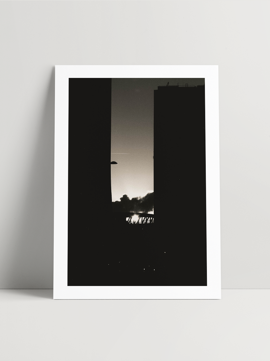 Cette photo, prise en sortant du travail dans les rues de Paris, est l’un de ces instants où la beauté surgit sans prévenir. J’avais mon vieil argentique dans la poche, comme toujours. Avec une pellicule noir et blanc très contrastée, j’ai capturé un interstice entre deux bâtiments : une fine ouverture sombre, une bande entourée d’une forme de U, au centre de laquelle passent les rails aériens du métro. Juste au dessus, un nuage noirci par le contraste. Et juste au-dessus, parfaitement aligné, un avion qui traverse le ciel, sa traînée blanche découpant la lumière.