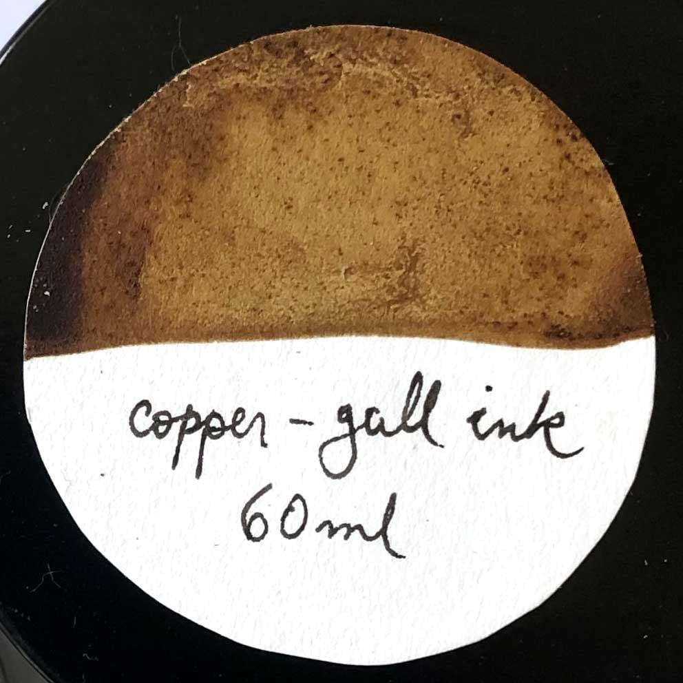 The inks in this series are based on early Islamic recipes for tannine inks (ḥibrحبر), fluid inks that react chemically with the support for a lasting bond: for a long time this quality made them the preferred ink for sacred texts. The main component is extracted from oak galls which I forage in my local woodlands, with a modifier to determine colour: in this case copper salt aka blue vitriol. Also contains gum arabic as binder and cloves for preservation.