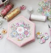 This free pattern shows you how to make a lovely hexagon needle book. The needle book is approximately 3 3/4 inches in diameter and 4 1/4 inches tall when finished and has felt pages inside to store your needles. It is the perfect size to fit inside the Hexagon Sewing Case and they make the perfect pair.