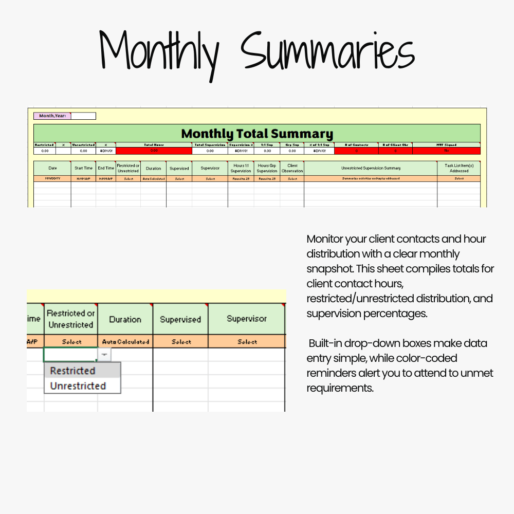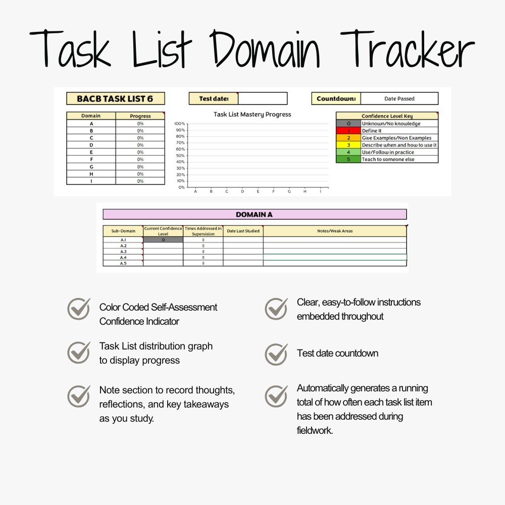 Stay organized, confident, and compliant with this all-in-one tracker built for supervisees and supervisors. Designed to make fieldwork management smoother while keeping progress at your fingertips. This spreadsheet includes the Task List Domain Tracker!