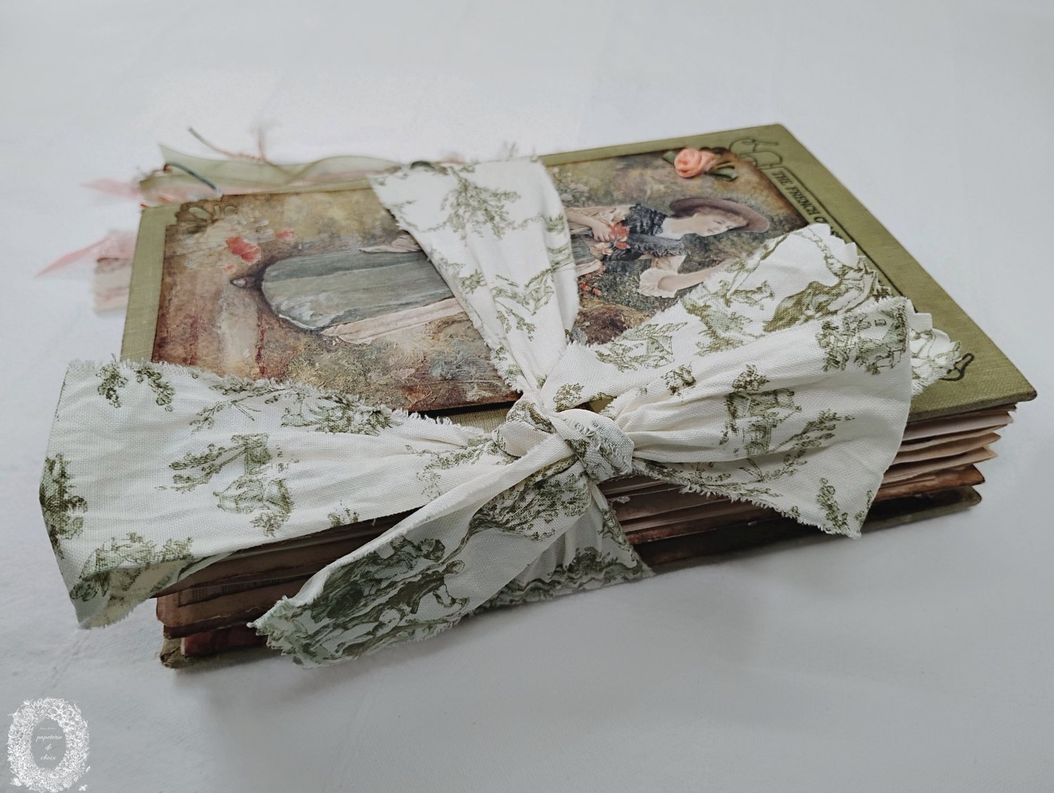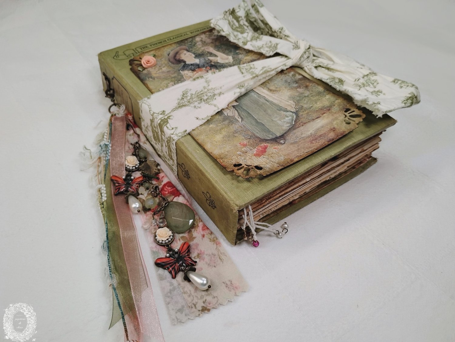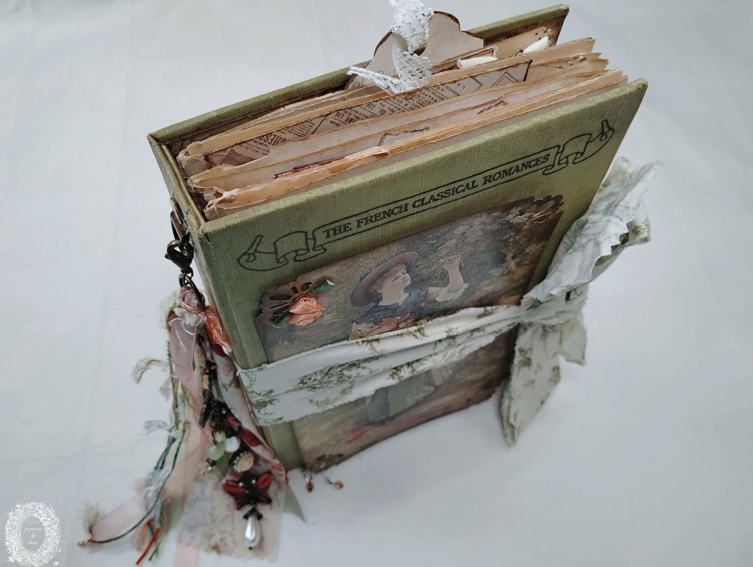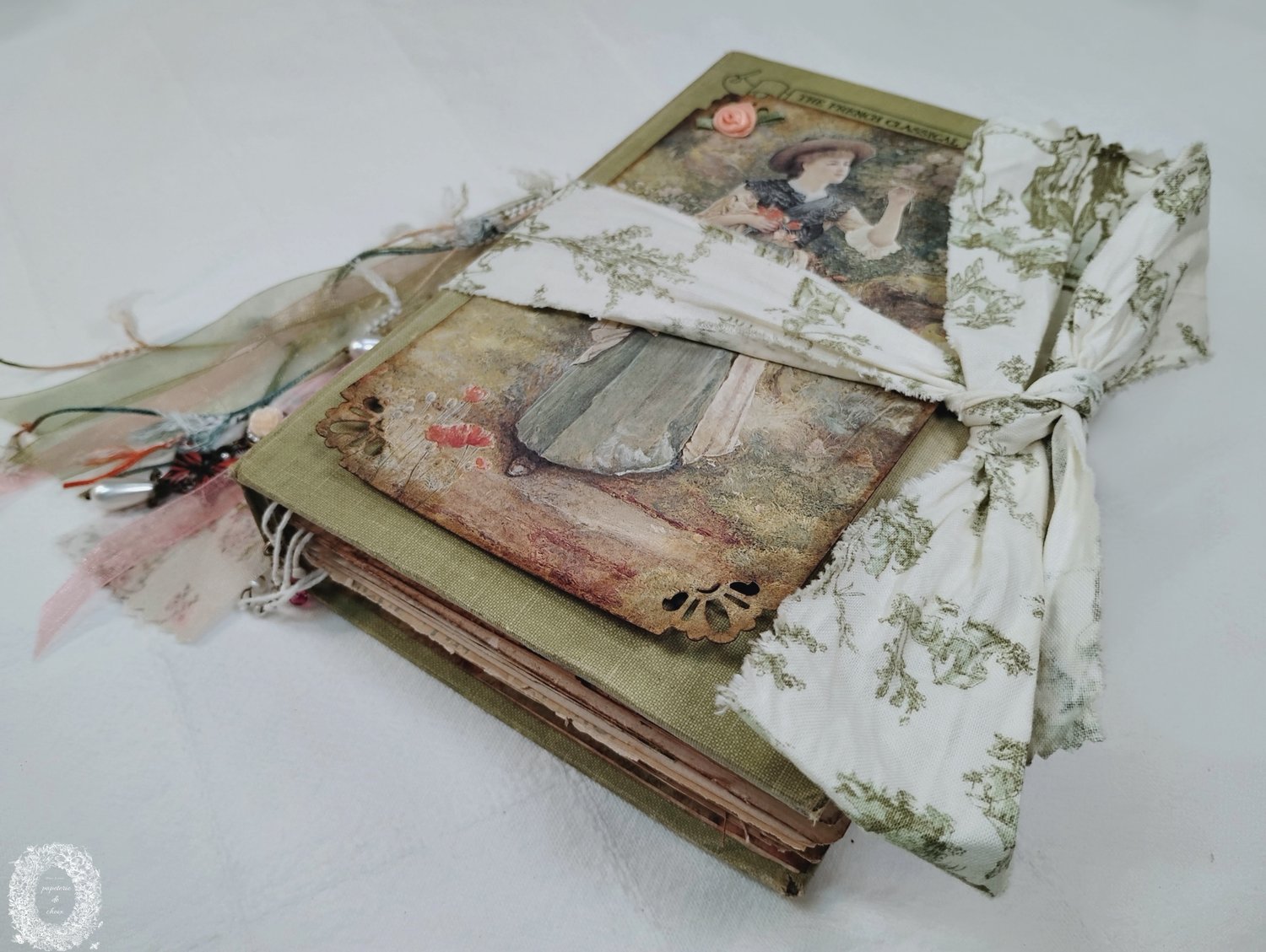 The Charterhouse 1901 is a journal made from a vintage book with the original cover that has 82 writing pages, 8 tags, 30 pockets/tucks, 26 journaling cards, 4 envelopes, 18 special ephemera, 5 signatures, measures 8.25 inches tall x 5.5 inches wide x 1.5 inches thick, and features several original pages from the book.