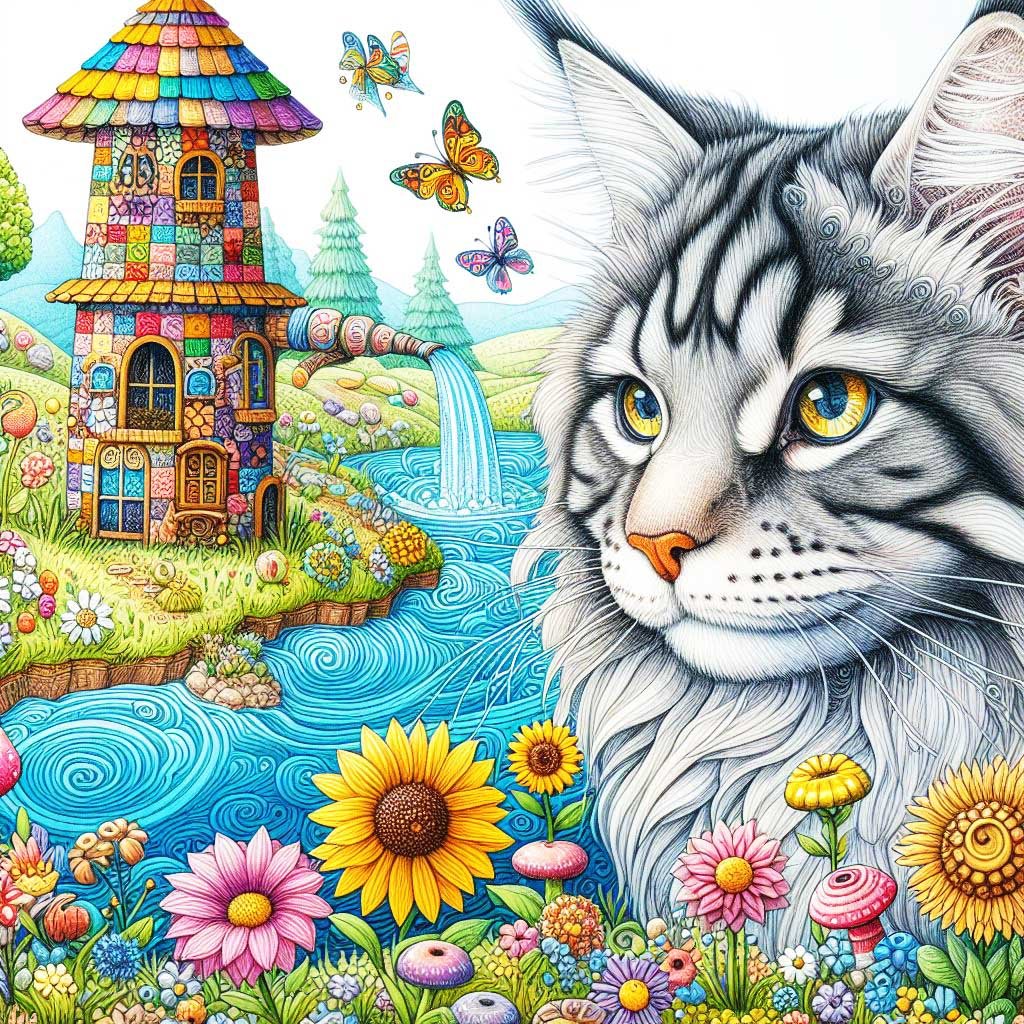 Maine coon cat beside a windy blue river. Hills are patterned with daisies, sunflowers, bluebells & poppies and colourful toadstools. There are Butterflies.