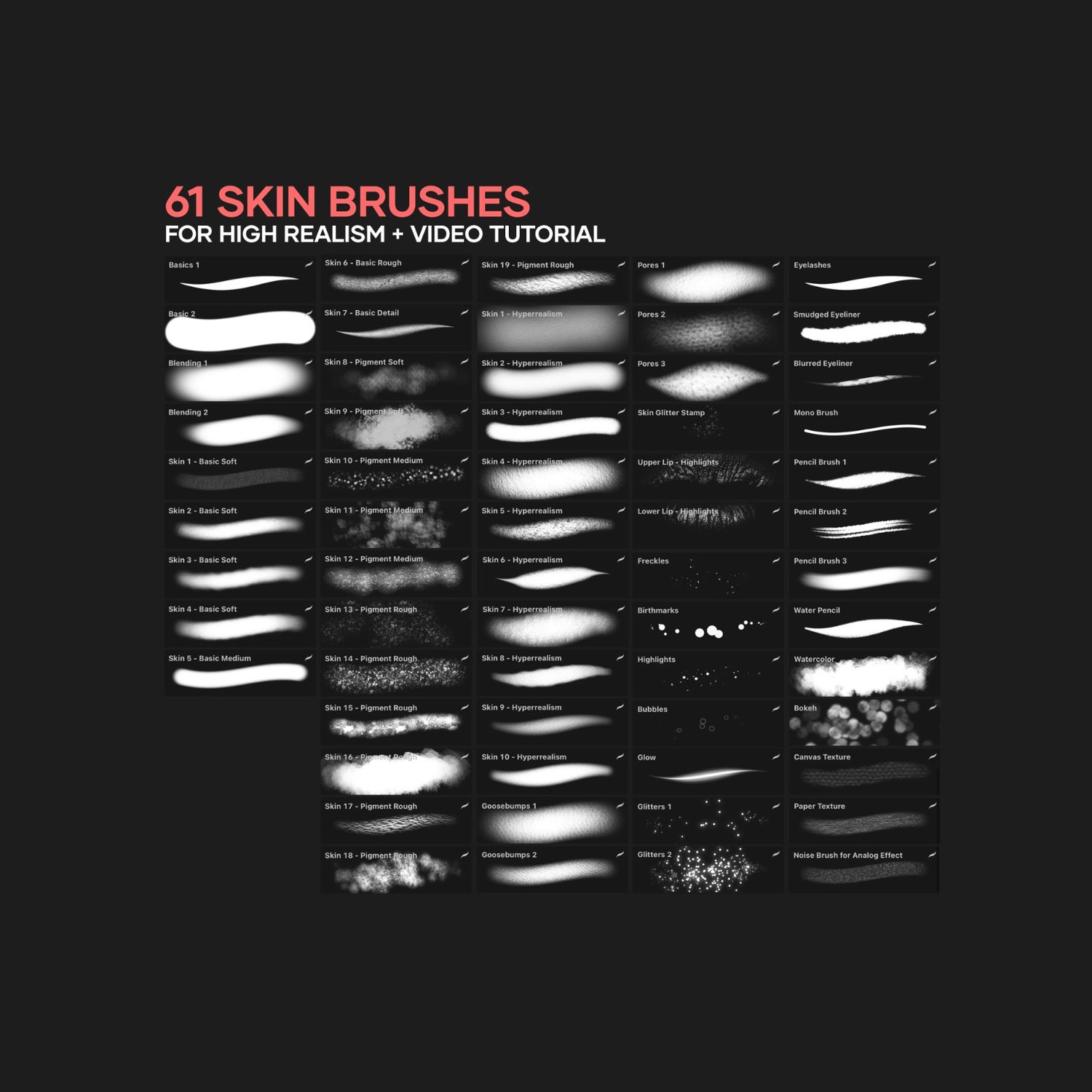 Here you have all of my 61 skin brushes + an additional video tutorial about how I use them to create realistic-looking skin!