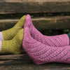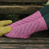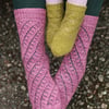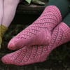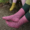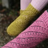 These mid-calf length socks commence with a twisted rib cuff followed by the delightful lace pattern, which stretches comfortably over the leg and foot. Selion has a traditional slip stitch heel flap which is easily adjustable to achieve a perfect fit. The top of the foot can be knitted in either the lace pattern or in stocking stitch, after which the toe shaping is worked before the toe is grafted together. The Selion pattern includes seven sizes from baby sizes through to adults and includes options to work the patterning on the socks in differing directions to make matching or mirrored socks!