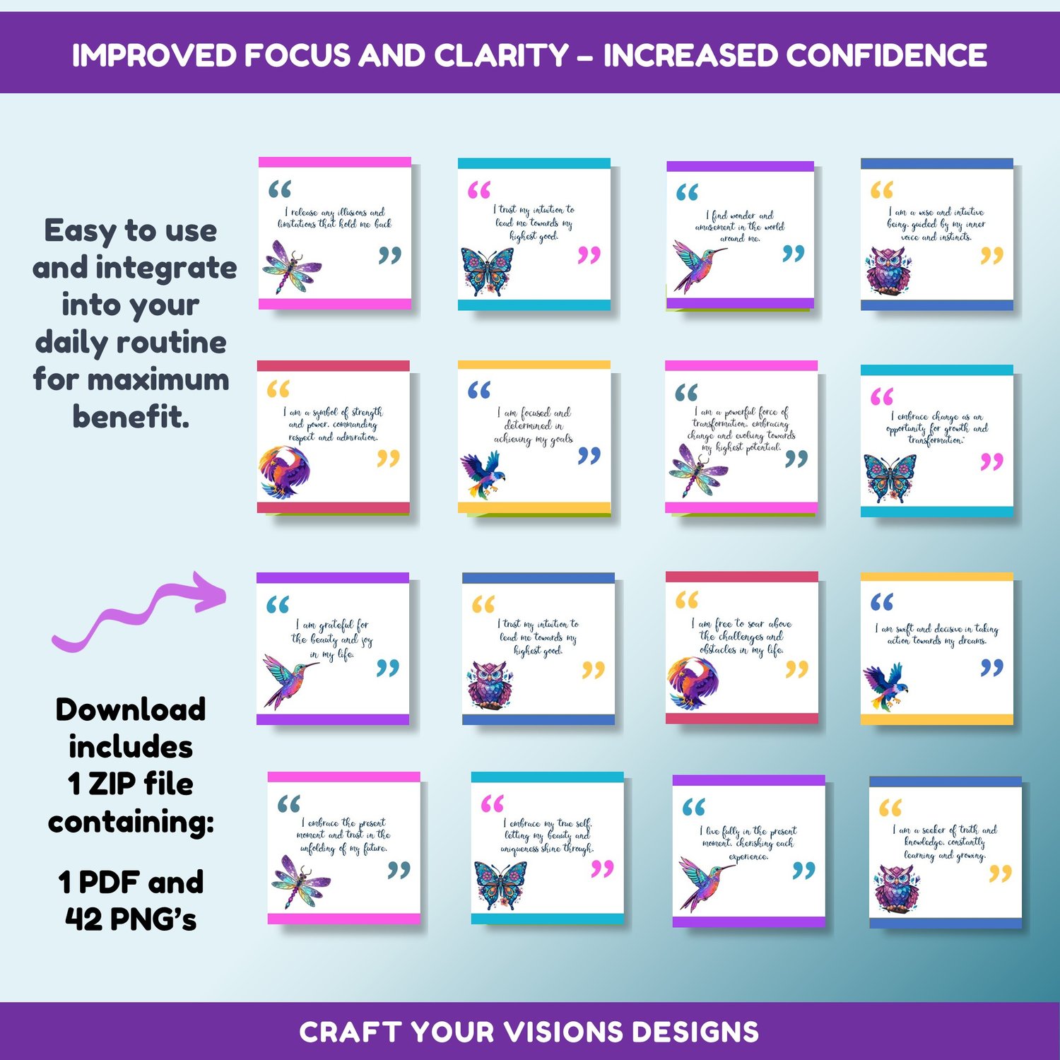 With a convenient zip file containing 48 Affirmation Card PNGs, 6 hi res clipart images, 1 Editable PPT file and 1 PDF, you can easily download and print the cards at home or at your local print shop. Each card features a stunning design that captures the essence of the spirit animal and affirmation, making it easy to connect with the positive energy they represent.