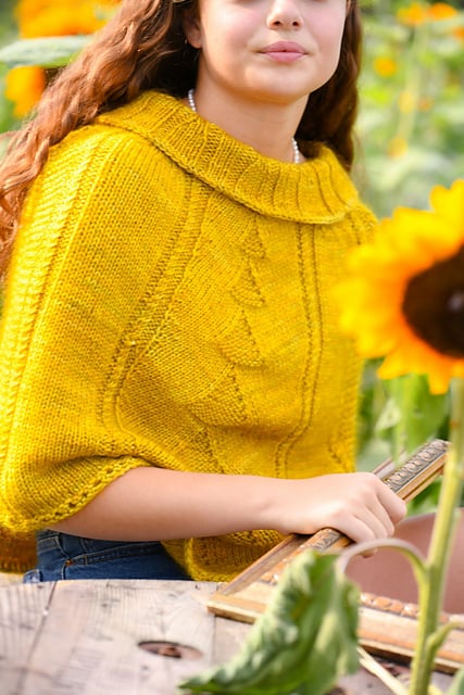The poncho is constructed with front and back panels, worked separately and then joined in the round for the ribbed neckline. It is worked bottom up, starting with a decorative border before following the chart/written instructions. Once the back and front panels have been worked, they are joined in the round and the ribbed collar is worked, incorporating a gentle flare to sit neatly over the shoulders. The shoulder is shaped with stitching and the sides are then grafted together, leaving a space for the arms to move freely.