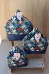 Three-On the Side- Set of three expandable zipper pouches. Finished sizes, Large: 9.5” tall x 7.5” wide and 4.5” deep Medium: 8” tall x 6.6” wide and 3.5” deep Small: 7.5” tall x 5.5” wide and 2.5” deep. Clip to carry and unclip to expand. The pouches nest inside each other for easy storage.