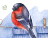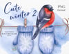 Knitted woolen mittens drying on a string. Bullfinch sitting on a string. Christmas, Winter, New Year decoration.