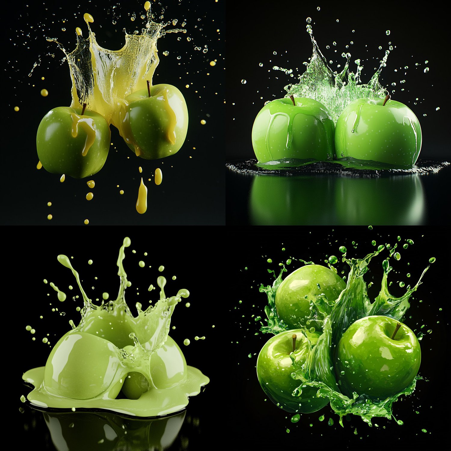 Create stunning food visuals with this prompt. Capture a **super wide-angle green apple waterfall splash** with liquid explosion on a pure black background, soft colors, and photorealistic details. Ideal for high-resolution product mockups, social media, ads, or branding projects.