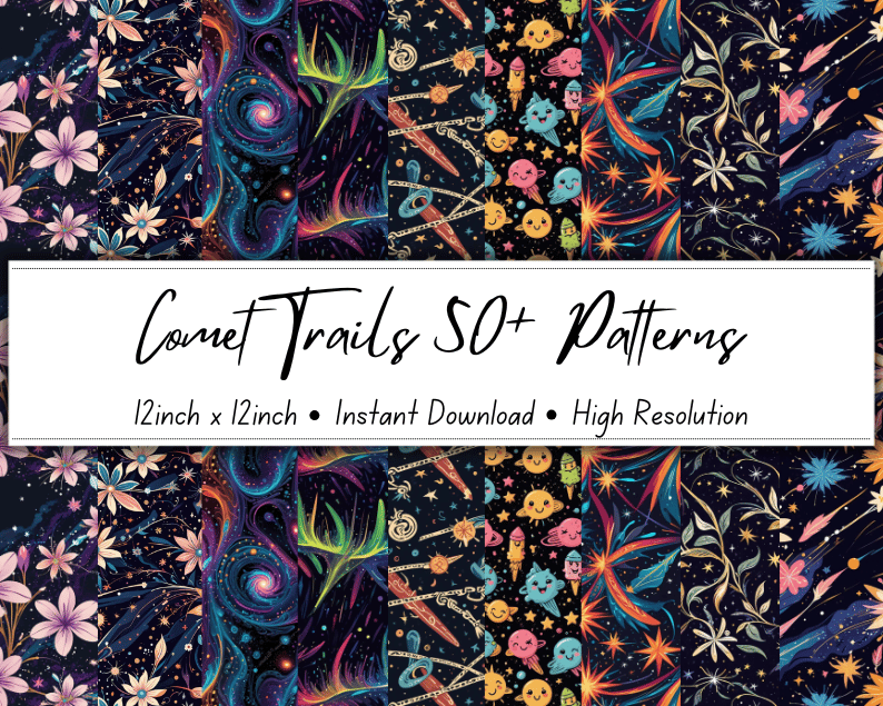 Unleash a universe of creativity with our Comet Trails Patterns Collection, featuring 50+ dazzling, high-resolution designs inspired by the dynamic beauty of celestial comets streaking across the night sky. These seamless patterns are perfect for any creative project — from digital designs and scrapbooking to fabric printing, sublimation, stationery, and more.