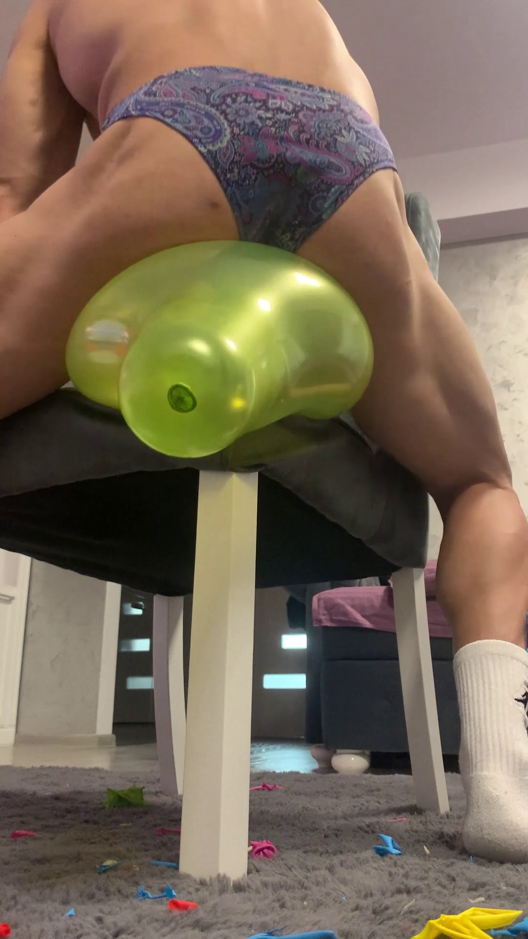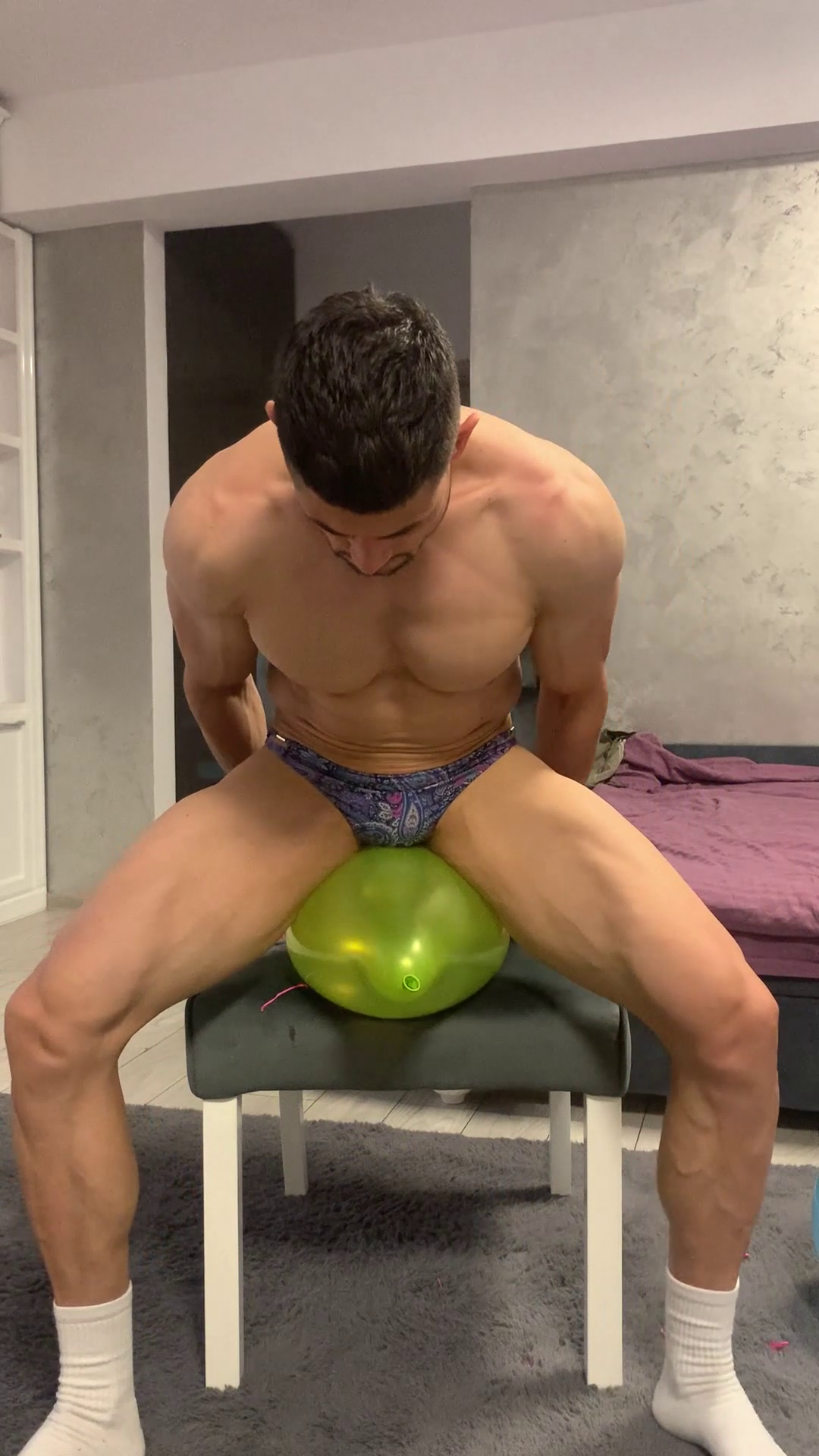 Octavio returns to pop more balloons with his ass! Enjoy his muscles while he destroys those poor balloons.