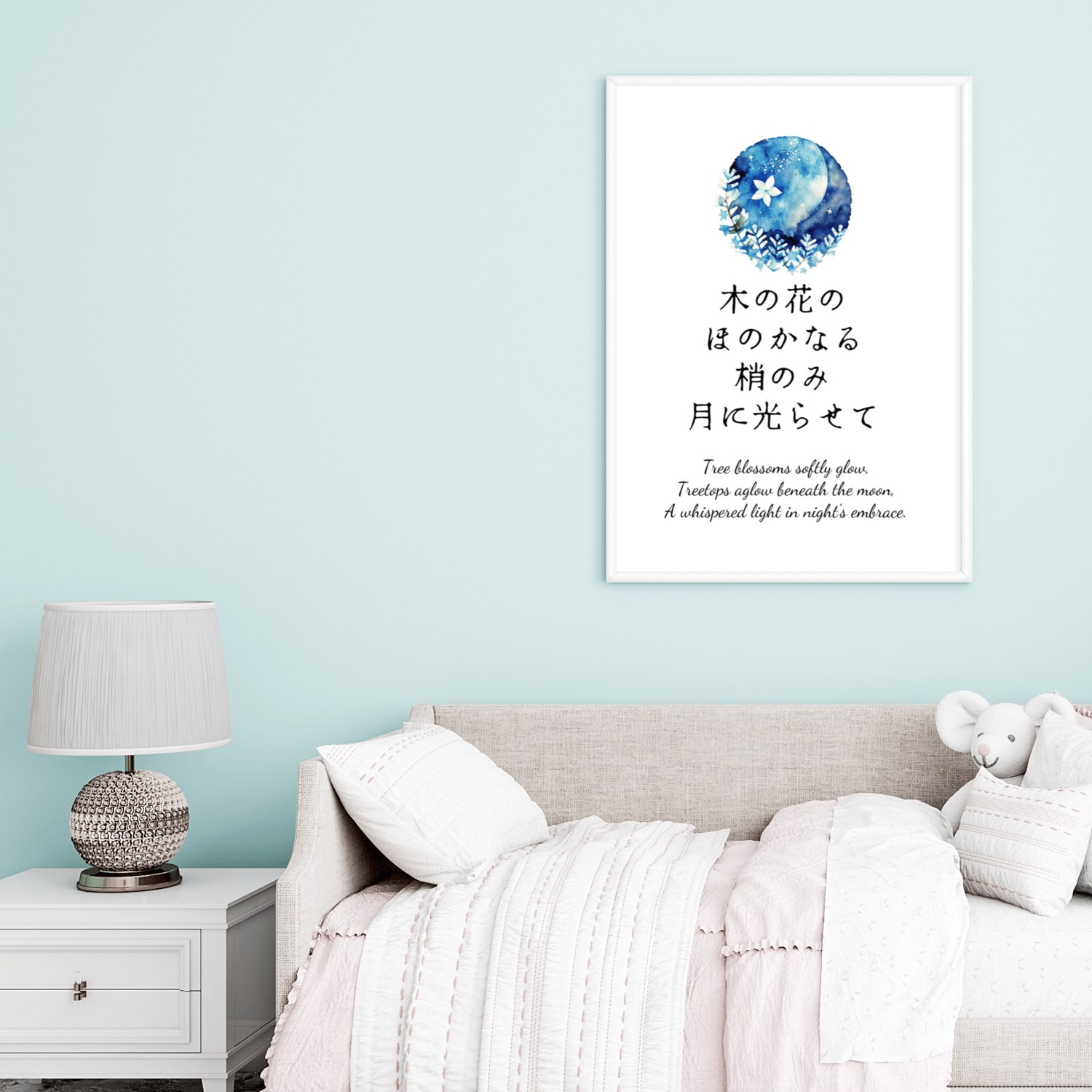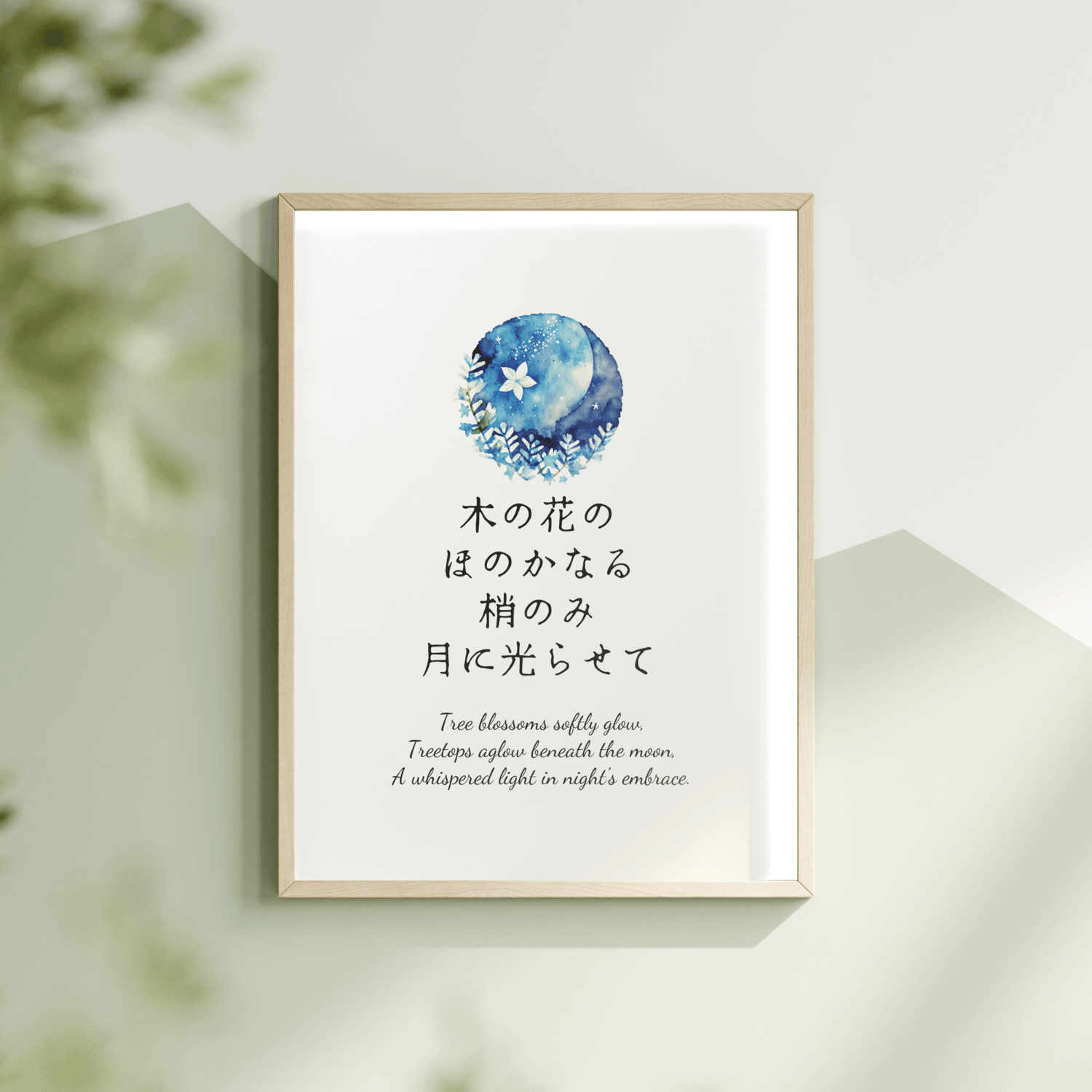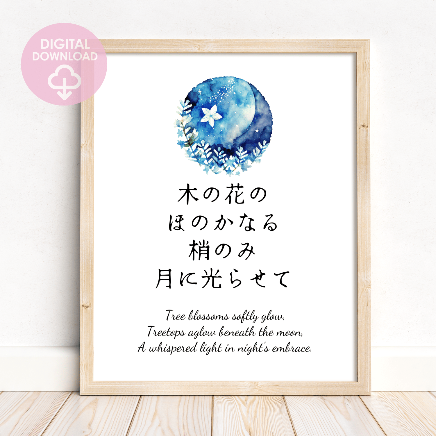 Experience the magical fusion of art and poetry with my printable wall art, featuring the works of Kitahara Hakushu. This design combines a beautiful moonlit night scene in watercolors with branches that seem to whisper the poet's words, presented in both Japanese and English.