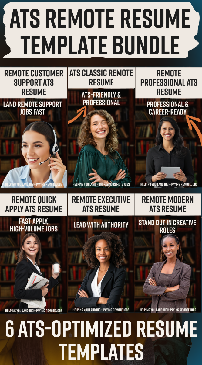 Instead of guessing which resume format works best, you get six professionally designed, ATS-safe resume templates—each built for a different remote job scenario.