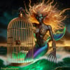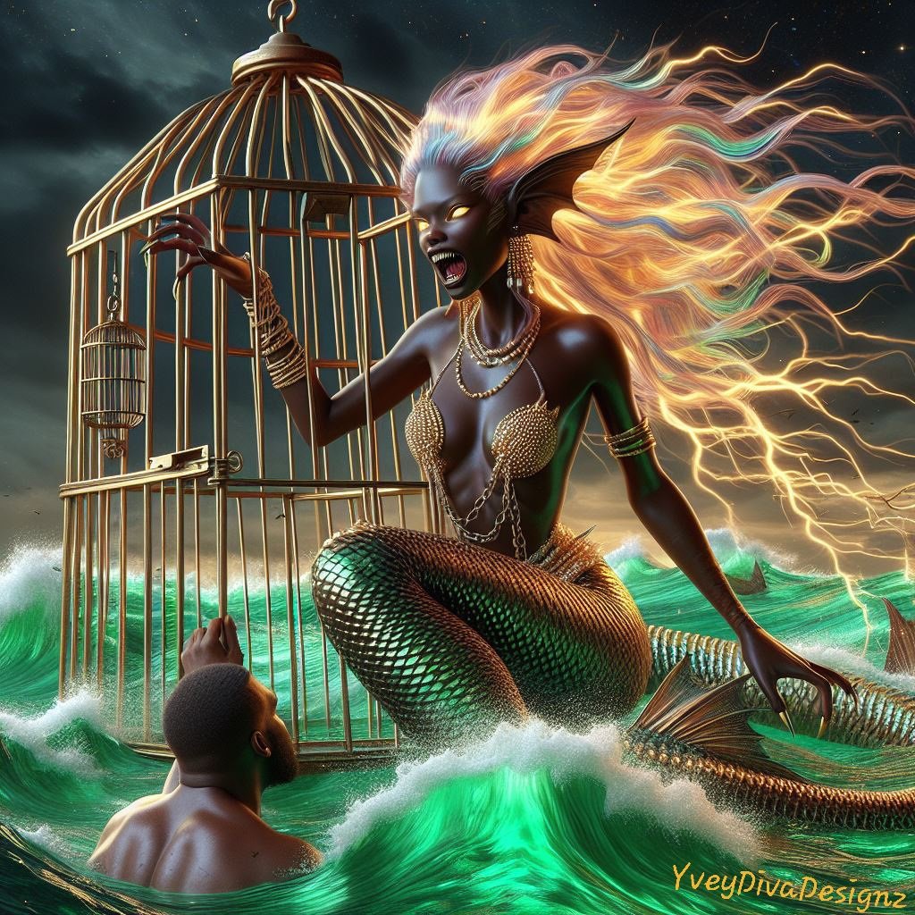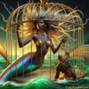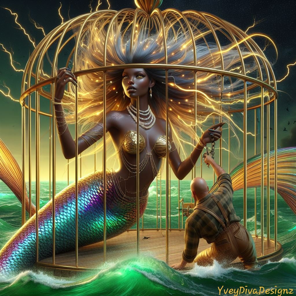 In the tempest-torn depths of the sea, three sinister mermaids writhe and twist, ensnared by the cage that binds them. Each mermaid's delicate yet deadly features are accentuated by the turbulent waters, their sinister allure drawing unwitting fishermen closer to their doom. The captive mermaids exude an eerie aura of both danger and vulnerability, trapped in their watery prison.