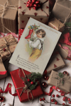 Keywords: vintage Christmas postcard, child with stocking, nostalgic holiday card, holly and gifts illustration, Christmas rhyme, retro holiday decor, printable Christmas card, vintage-inspired holiday art, Christmas gift tag, seasonal scrapbooking, holiday postcard printable.