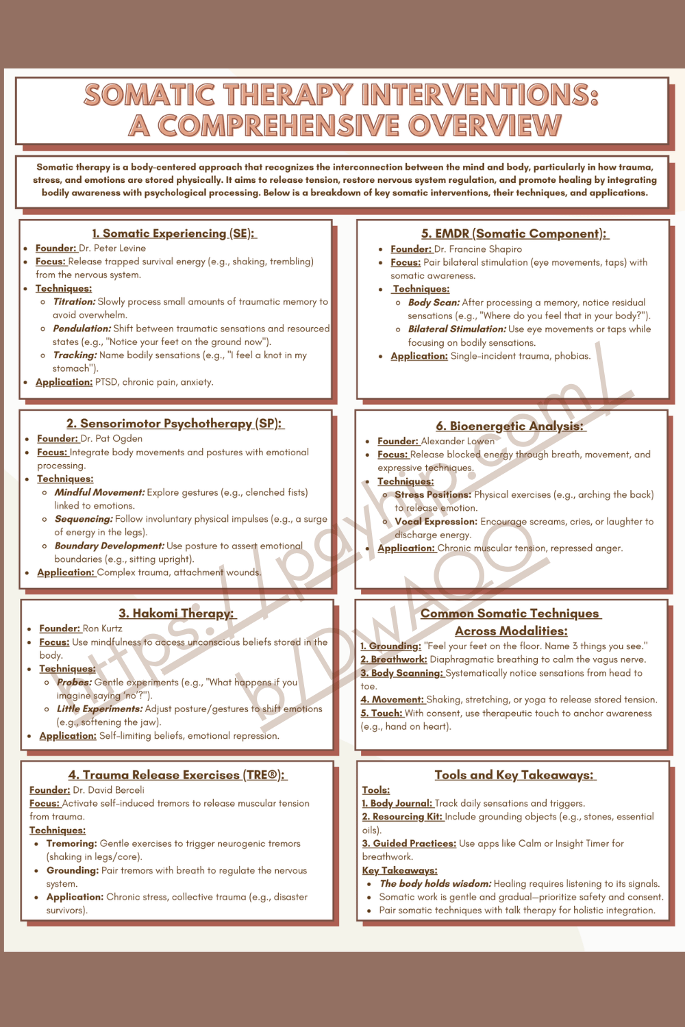 Somatic therapy is a body-centered approach that recognizes the interconnection between the mind and body, particularly in how trauma, stress, and emotions are stored physically. It aims to release tension, restore nervous system regulation, and promote healing by integrating bodily awareness with psychological processing. This worksheet offers a breakdown of key somatic interventions, their techniques, and applications.