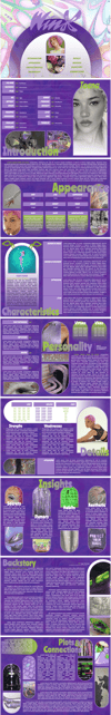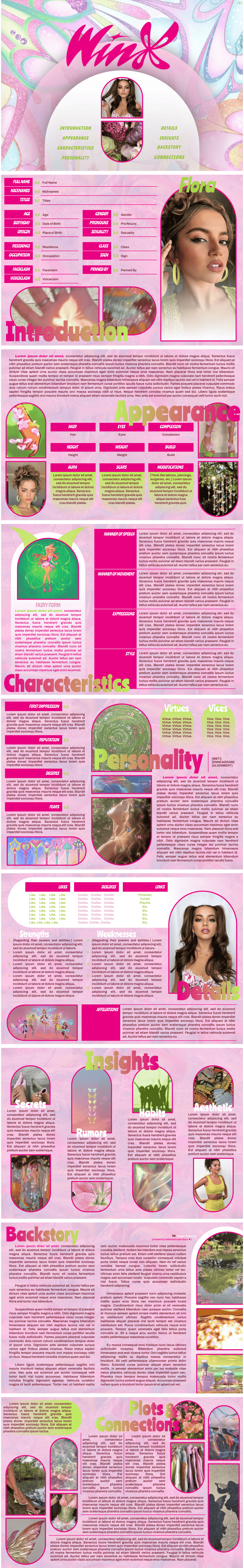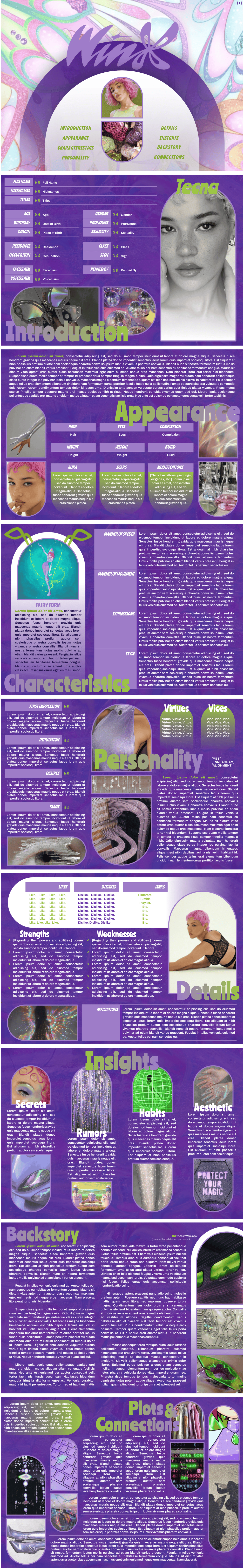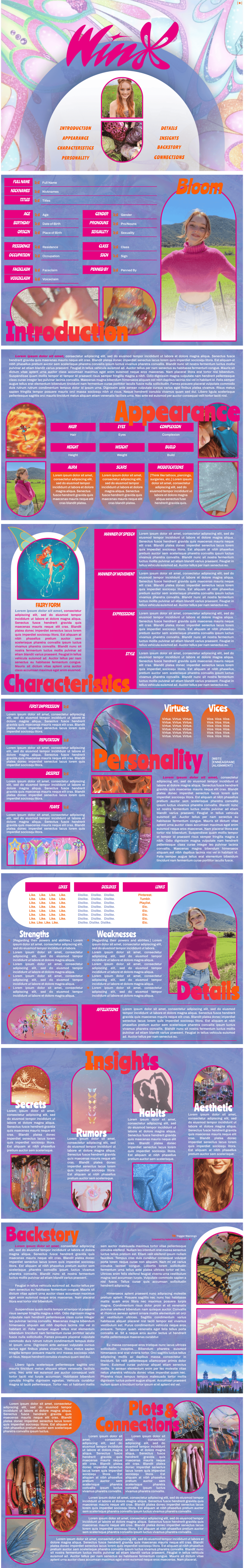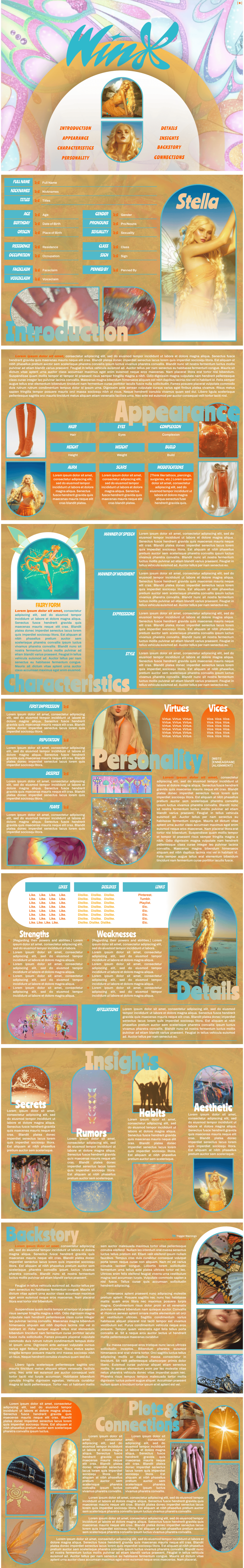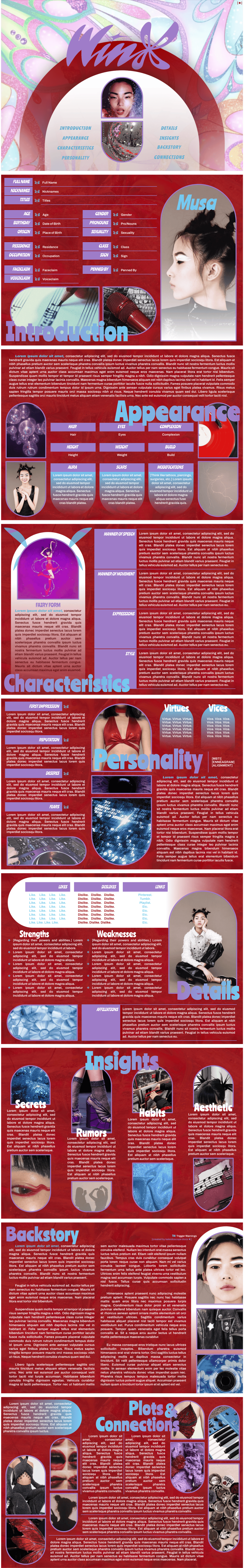 Page Order: Cover, introduction, appearance, characteristics, personality, details, insights, backstory, and connections.