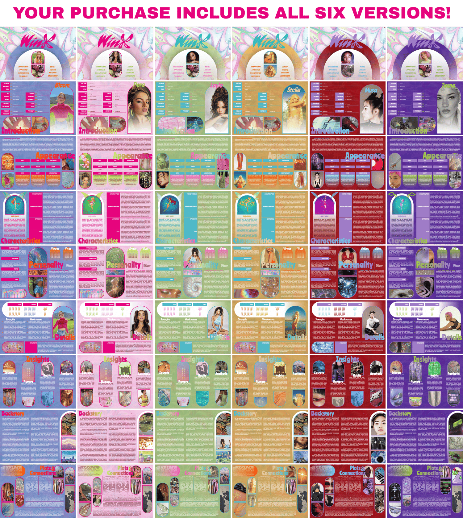 Coming your way in six color variations to show you just how easy it is to become the guardian of your next idea. Take this template from Bloom, Flora, Layla/Aisha, Musa, Stella, or Tecna...to your very own creation! I can't wait to see all the magic and wonder you spin with this one! I know you will more likely be using this for your own characters, but I couldn't help but channel my love for our childhood nostalgia faves! And I didn't want to make you choose between them either. That's why this purchase includes all six versions!! Each girl has their own nine-page Google Doc template!