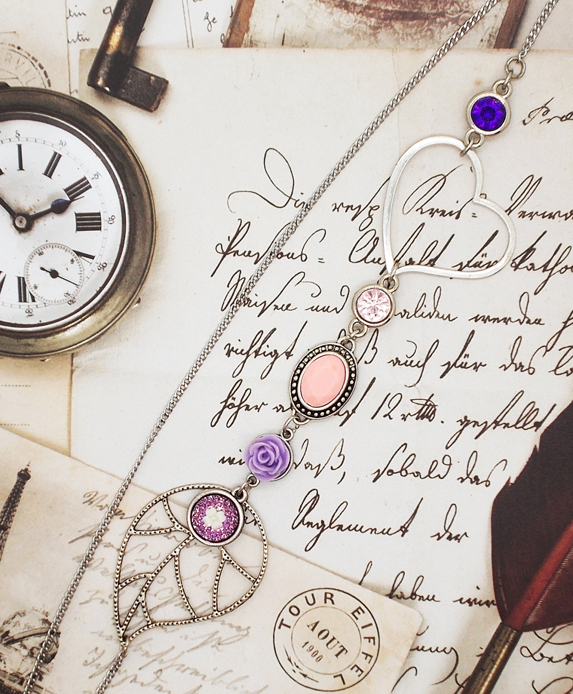 Handcrafted with steel chain; glass, acrylic and resin elements