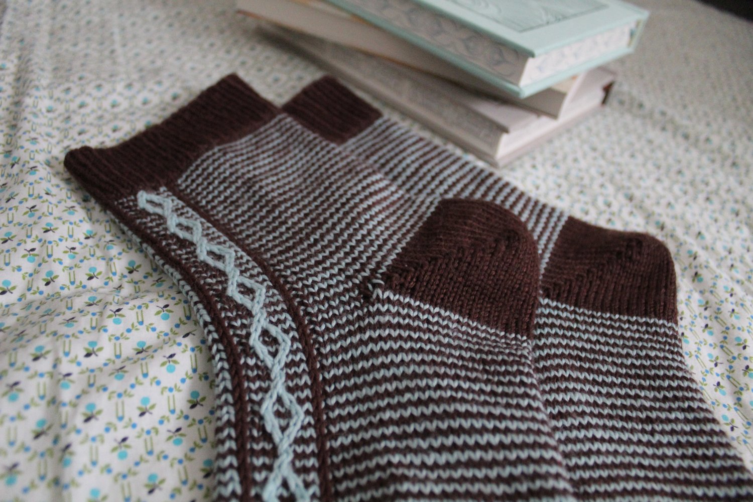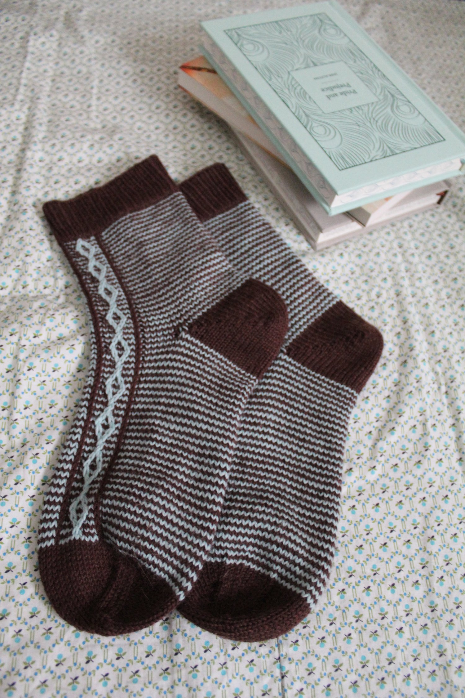These socks are knit top-down with my favorite techniques: a shadow-wrap short row heel and a rounded toe. The pattern is written for a 9” / 23 cm circular needle (with magic loop or DPNs recommended just for the toe), but it’s easily adaptable to whatever small-circumference method you prefer.