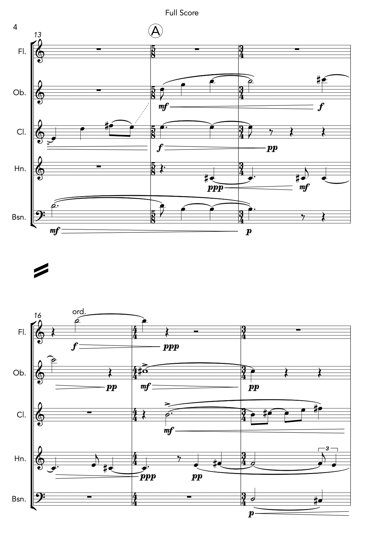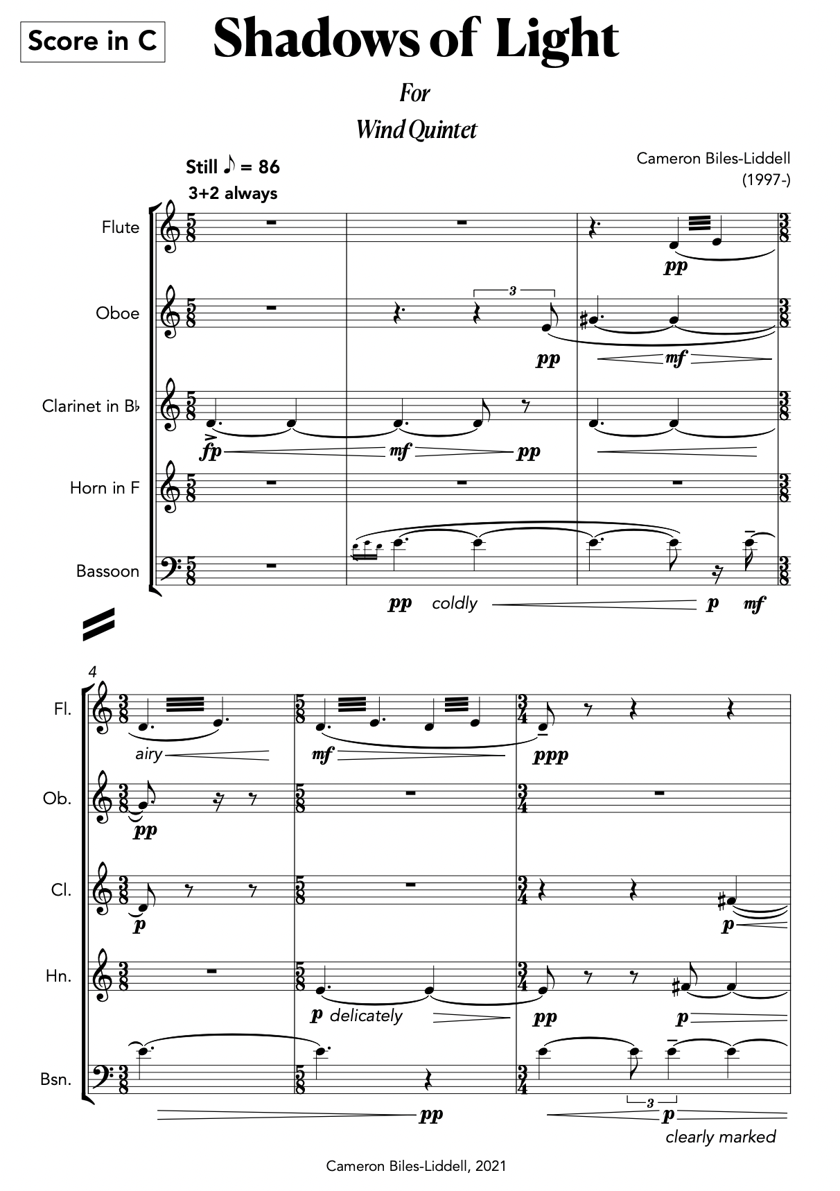 Shadows of Light is an exploration of the timbral combinations and rich expressive harmonies that can be produced in this rich instrumentation. I found approaching the wind quintet ensemble incredibly challenging, with each instrument having a unique colour and timbre within the ensemble. From this, I decided to use the individual colours as a feature of the work, where a melodic line is passed around the ensemble. By dovetailing this slow line, I showcase the vibrant colours available in the Wind Quintet, where each individual note of the line provides the resonance to create my rich harmonies. This line gradually builds in energy, where the climax features the horn and oboe reiterating a soaring melodic line. After this climax, the melody disintegrates with each instrument pulling the harmony in different directions, leaving only the resonance of my harmonies, bringing Shadows of Light to a close.
