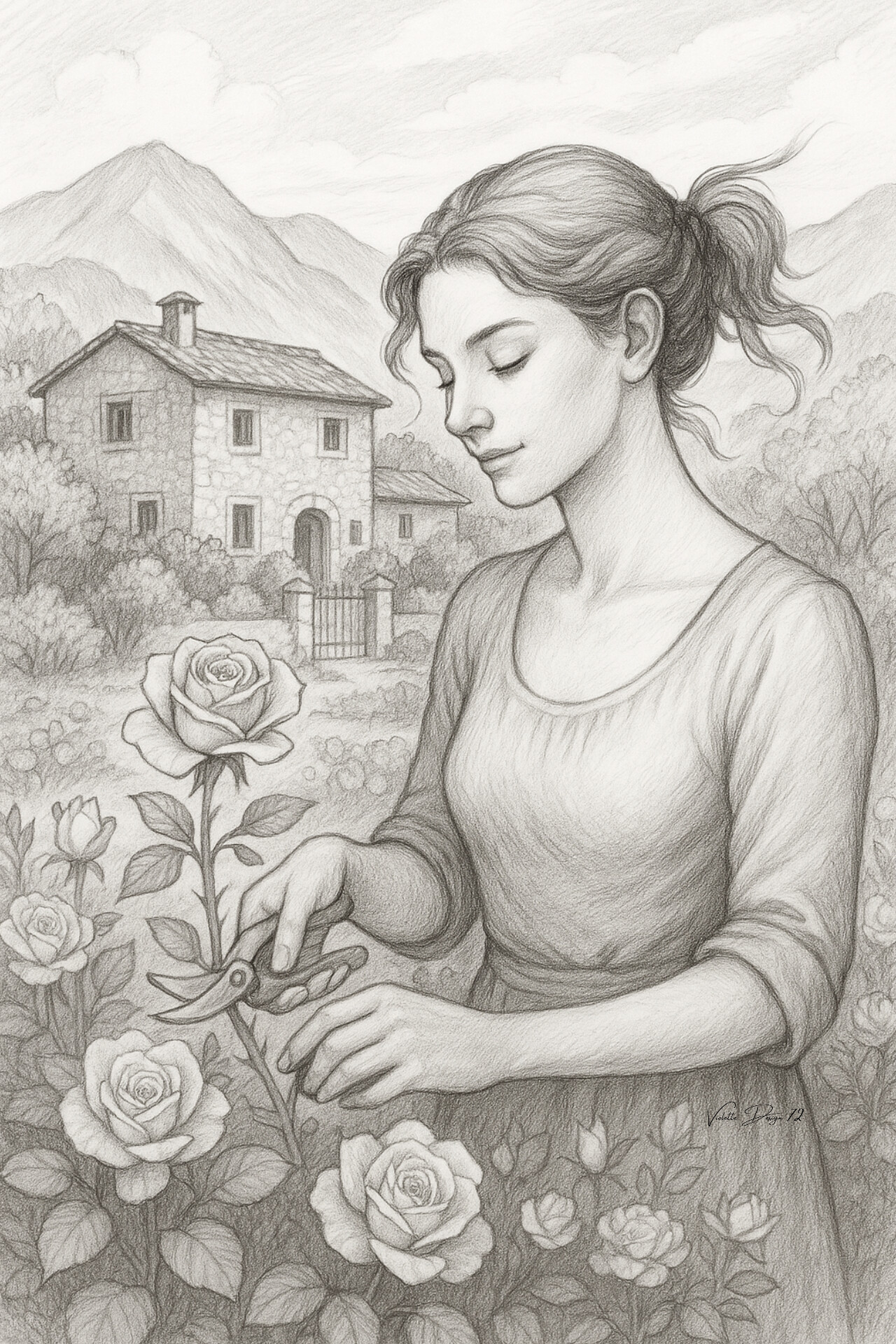 Use soft colored pencils (3B–6B) to maintain the delicate nuances of the original line;