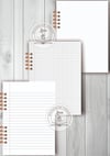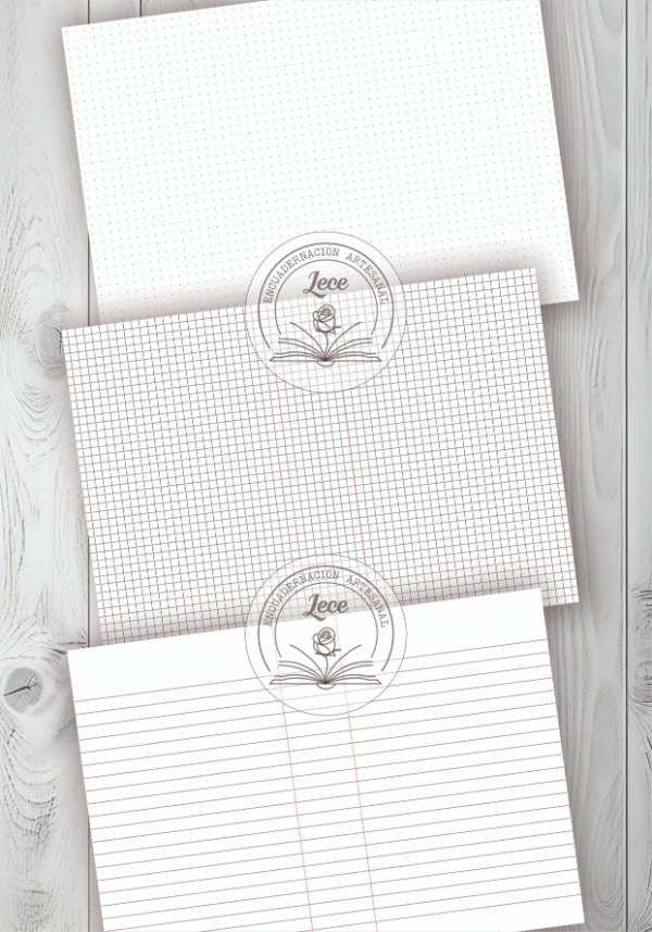 - 3 modelos de interiores: rayado, cuadriculado y punteado y sus variantes para imprimir en tamaño A5 y A6 para anillado y para doblar y coser o abrochar