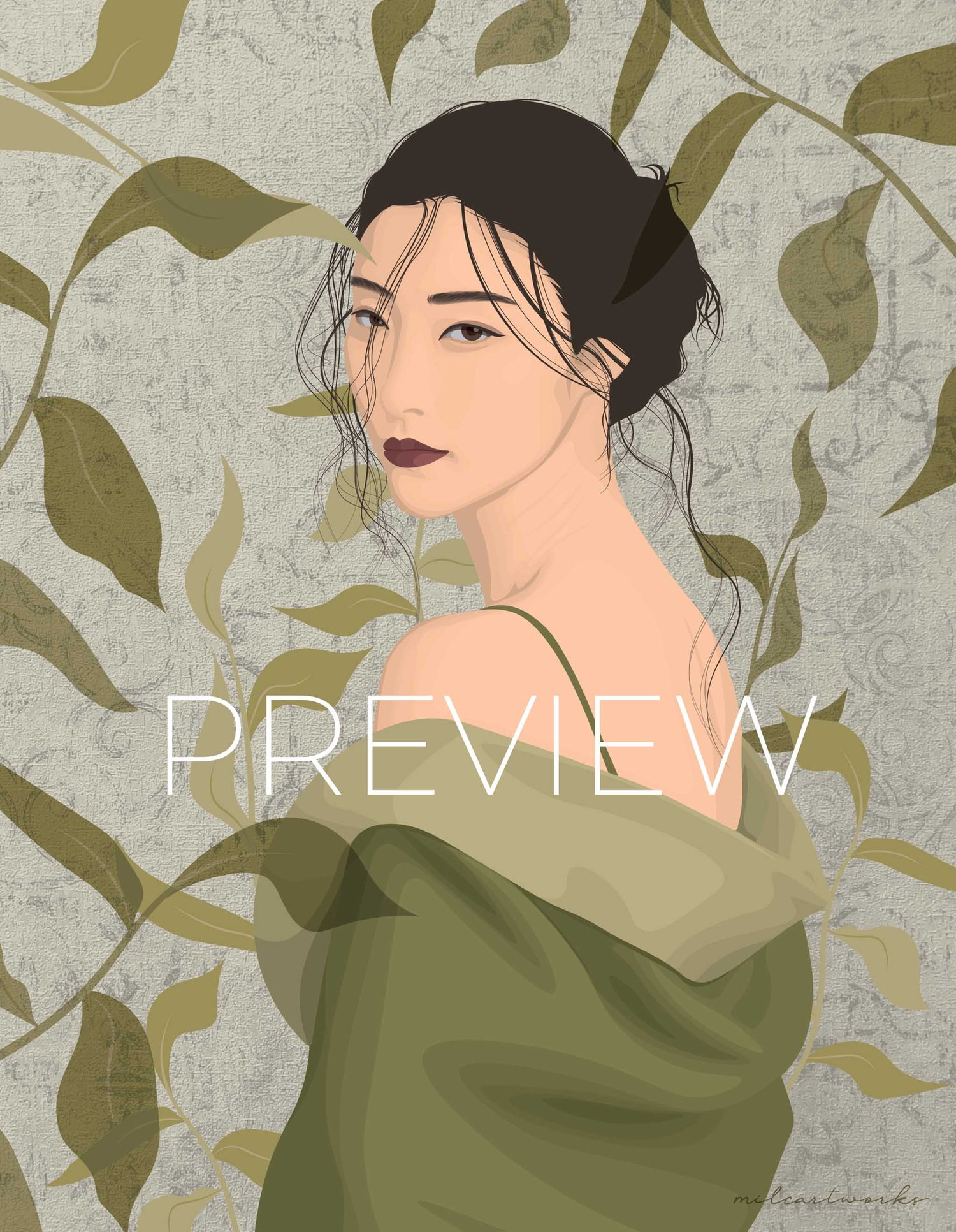Printable Green Botanical Female Portrait Art - Minimalist Leaves Line Work