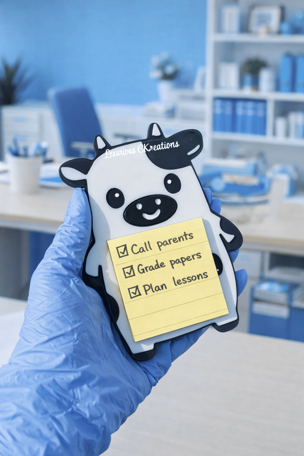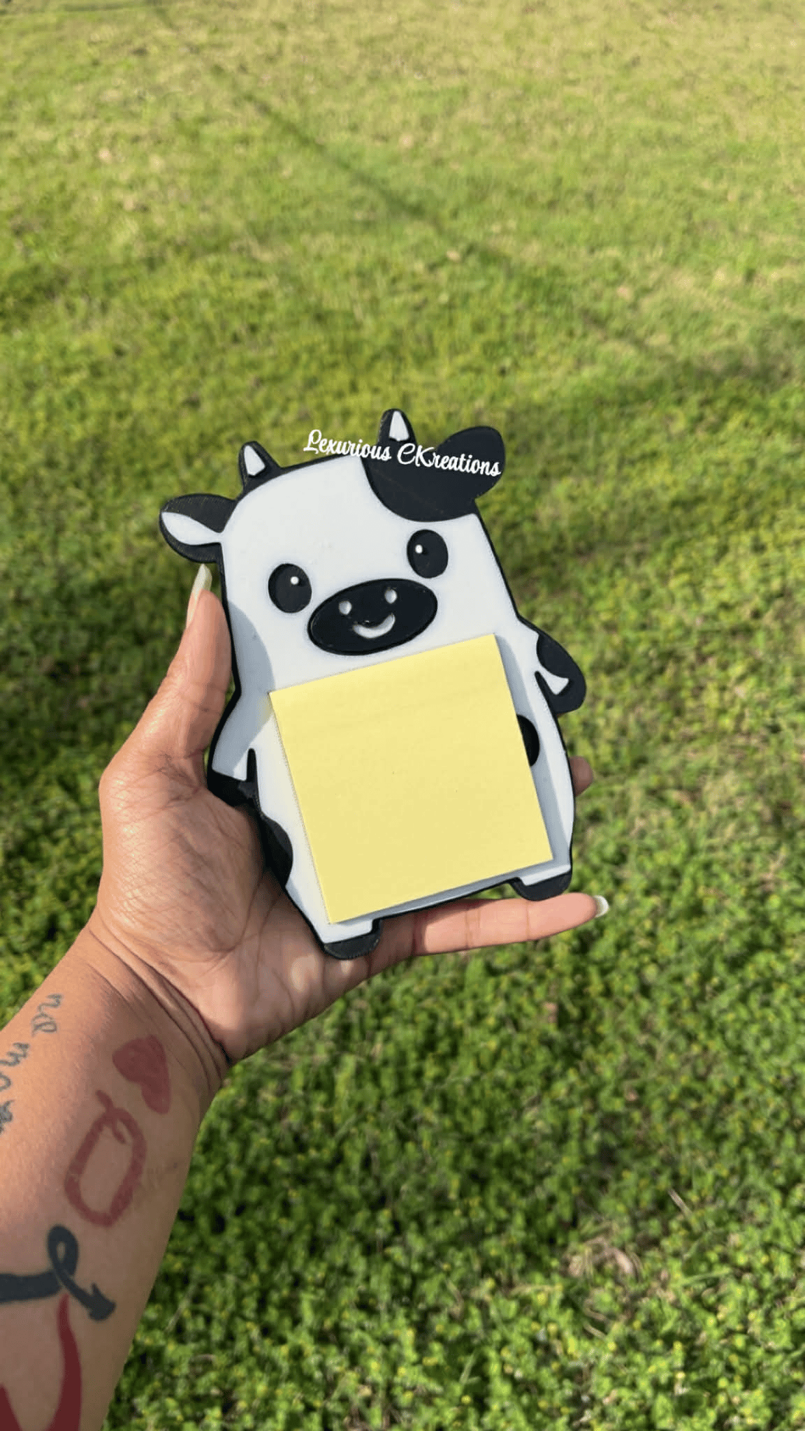 Upgrade your workspace from basic to "Lexurious" with The Moo-dern Desk Assistant. This custom-crafted memo holder blends a playful cow-themed aesthetic with a high-fashion "Soft Life" finish, ensuring your reminders are always served with style. Designed for the unbothered CEO who loves a touch of whimsy in her opulent office, this holder turns standard 3x3 notes into a desktop statement piece.