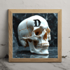 The letter D skull obsidian marble deeply engraved character on the forehead of a white marble skull. The character, filled with dark obsidian, contrasts sharply against the pale skull. Set against a black crystalline background, the skull and character dominate the image.