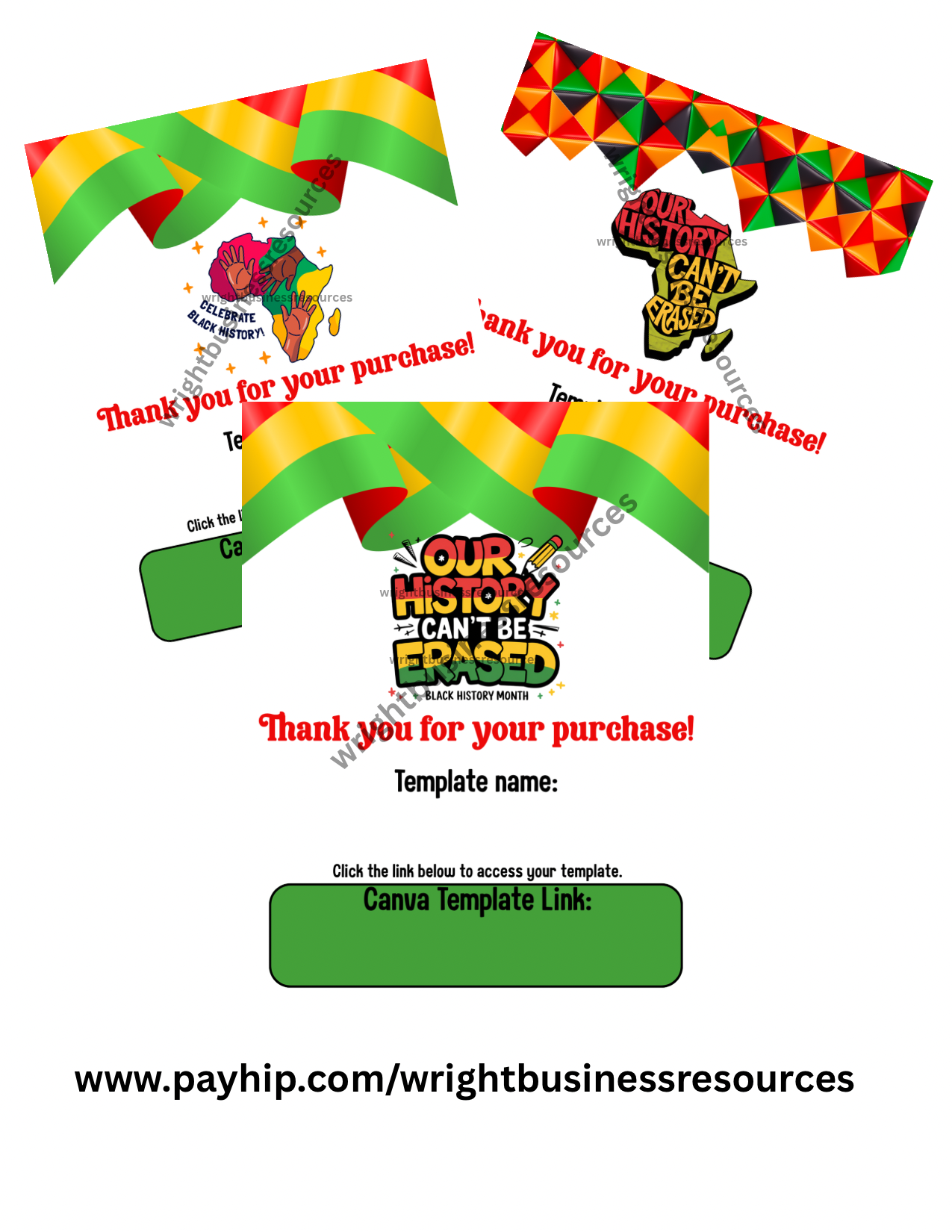 Canva link template cards are nice way to deliver your Canva link template to your customers. Instead of a boring, plain thank you for your purchase card, why not have a themed one or even one personalized to your business? In this file there are 3 different cards to use during Black History Month or anytime of the year if you choose. No need to print anything off just use digitally. Load to canva add your business info to personalize the template and definitely add your Canva link to the template you are selling. Download as an off so the customer will be able to access the link and load to your site for your customer to purchase that template.