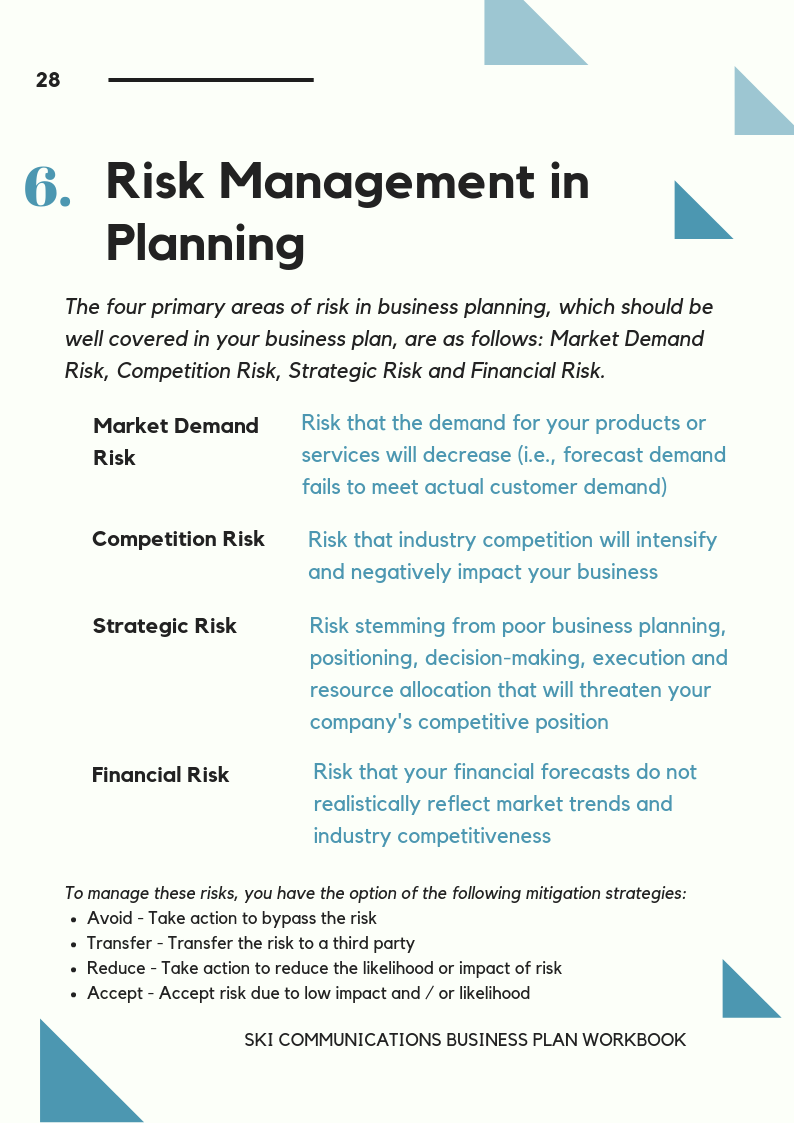 - Help you outline strategies to manage various risks in business planning, and