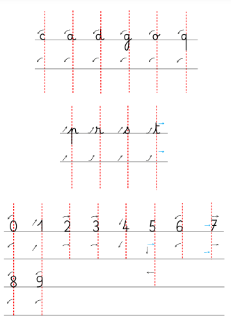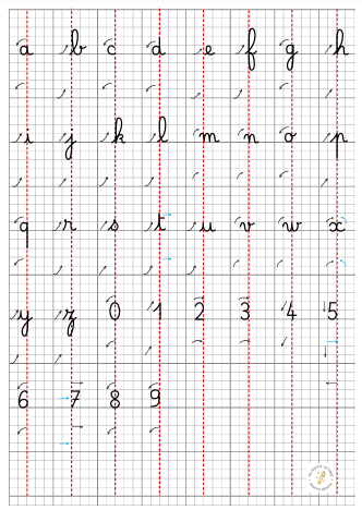 Les lignes rouges en pointillés servent de repère pour "adosser" les lettres/les chiffres ou placer le point de démarrage. On peut ainsi verbaliser en demandant aux enfants de "longer le mur rouge" par exemple. L'objectif est d'avoir une direction de lettres régulière et ainsi d'éviter les collisions entre elles pouvant nuire à la clarté de l'écrit.