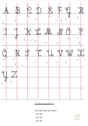 Un codage couleurs, pour les flèches qui guident le tracé, est expliqué sur les fiches des majuscules (cela vaut aussi pour les minuscules et les chiffres) :