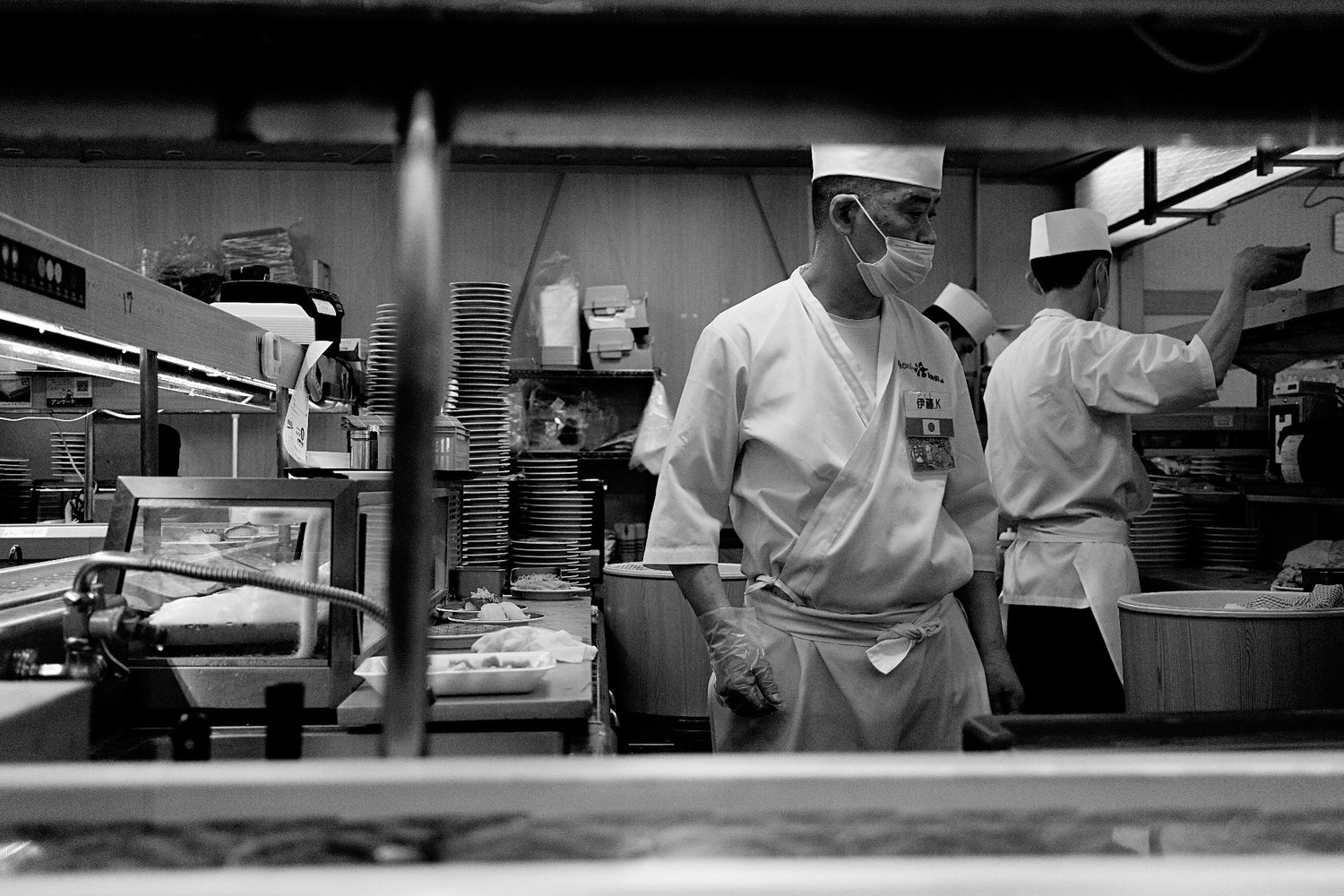 Sushi Chef at a local conveyor belt sushi joint in Tokyo, Japan