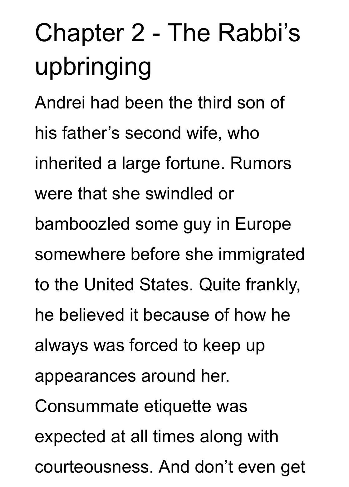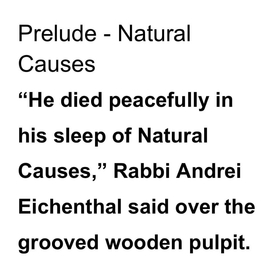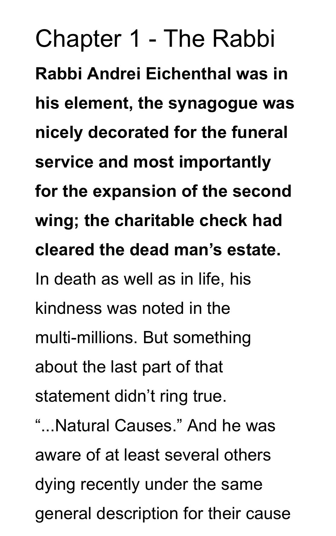 A tenacious Jewish Rabbi, who is well connected and respected, uncovers a plot amongst those in the area of his synagogue in downtown San Diego. First one, then a whole slew of people pay a nurse by the name of Miriam Blau for the use of end of life drugs like morphine to end their suffering. A part of the “Health and Understanding” package she offers is a ten year transition period in which she offers things like food and health support at a rate per month. Which can be expedited in lieu of certain circumstances such as a diagnosis or unexpected crisis like the failure of yet another dreadful marriage. Initially started as an offhand way to poke fun at death, before she knew it, she had so many patients that she quit her day job and became an around the clock angel of death. She meets with the rabbi who goes to meet her undercover (disguised as a man twice his age who happens to be facing a grave illness), as he has been told by a small boy that a large number of his congregants have signed up for a massive transition to death. Apparently only told so that he can have enough scheduling slots open to hold back-to-back funerals. He is offended! Surely his derasha sermons or rabbinical lessons aren't that bad?! A good section of the book series is their in depth dialogue exploring a number of existential topics, while she has locked him inside her house’s therapy room in order to persuade him not to turn her in to the authorities. He finally manages to escape and there is a chase as she has a plan to get the full list of the temple congregants in order to turn them against the rabbi and increase the number of those she’s planning to inject with the end of life medicine. Deeply thought provoking, yet very human. Sure to be a conversation starter that is read across many religions and cultures.