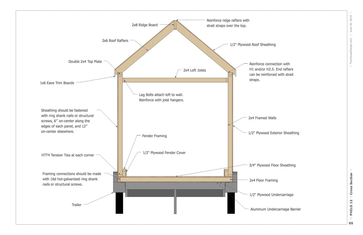 The Philo is the smallest tiny house on wheels in the archive set of tiny house plans. Despite its size, the plan demonstrates my specific drawing style: instead of cryptic architectural symbols, I use 3D framing diagrams that read like step-by-step assembly instructions.