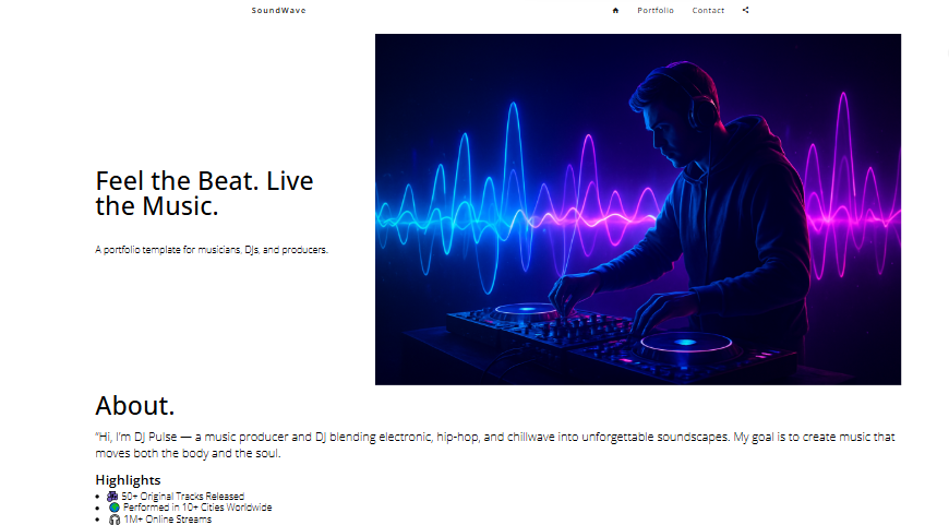 A stylish 3-page portfolio template for musicians, DJs, bands, and producers. Showcase your tracks, albums, and events in a fully responsive, modern layout designed to grow your audience.